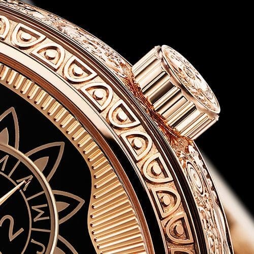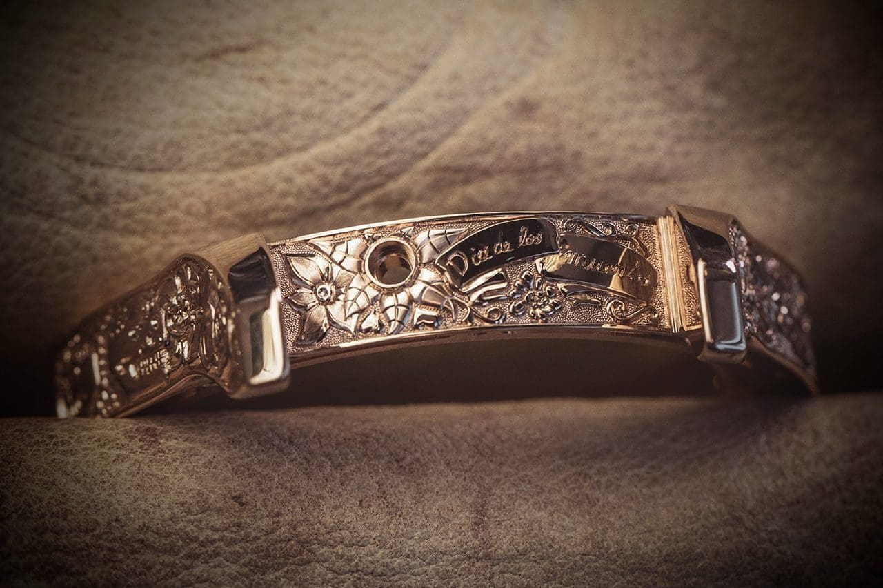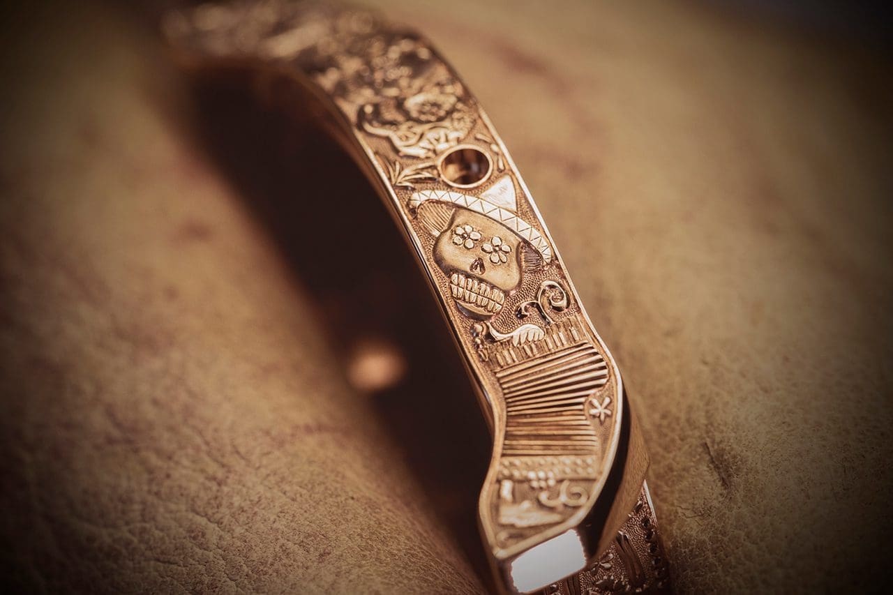 The Caseband of the 43 mm, 18-carat rose gold case is adorned with skulls, flowers, suns and guitars. The Bezel has patterns inspired by Mexican iconography. A stylised Mexican Calavera skull, dotted with sun and floral-themed patterns dominates the dial.