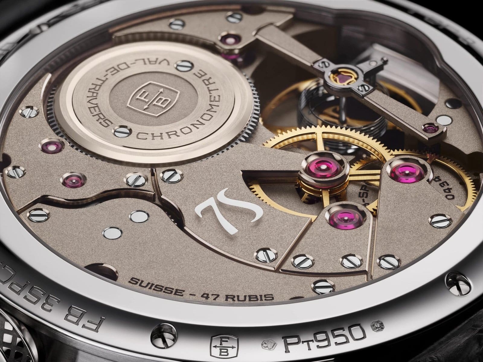At its heart lies the celebrated calibre FB-SPC, the world’s first chronometer-certified wristwatch using a cylindrical balance spring paired with a variable-inertia balance. Inspired by an 18th-century decimal timepiece created by Louis Berthoud, the movement proudly showcases its regulating organ at 9 o’clock, offering collectors a clear view of its cylindrical hairspring breathing rhythmically through the platinum porthole. The architecture remains a masterclass in transparency, depth, and mechanical truth.