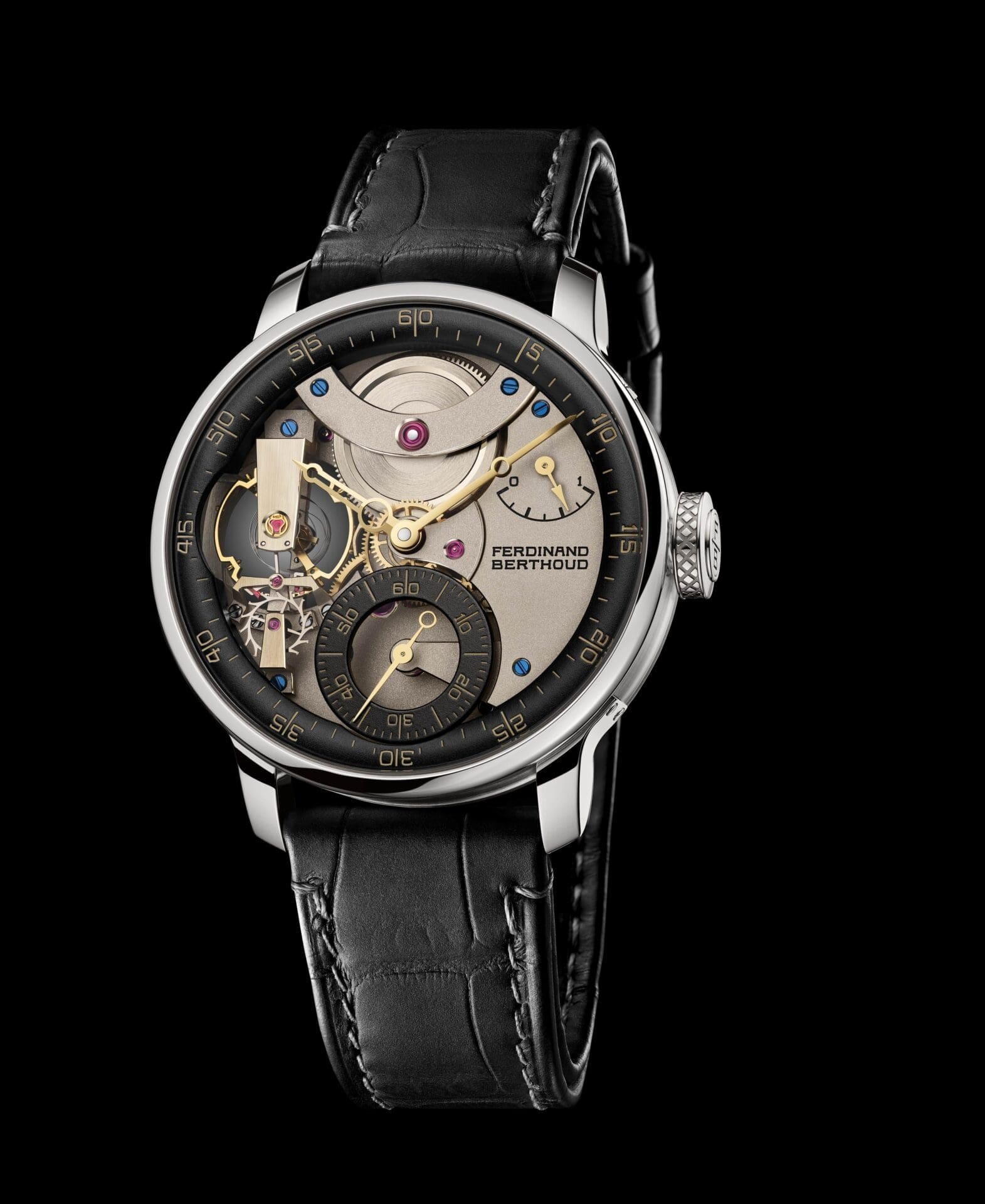 Crafted in platinum and limited to just three numbered pieces, the FB 3SPC.3-4 Seddiqi Edition amplifies the unique character of the original model with new finishes and a refined aesthetic. Its 42.3 mm PT-950 case is paired with a black lacquered peripheral inner-bezel ring engraved and gilded for a striking contrast. The champagne-toned sandblasted movement bridges elevate the visual architecture, while yellow gold hands ensure exceptional legibility—a harmonious blend of sophistication and mechanical intent.