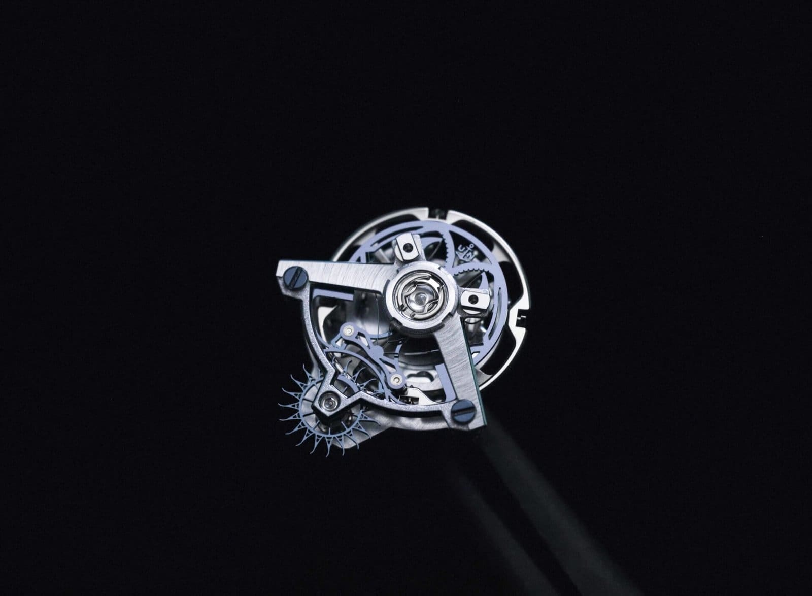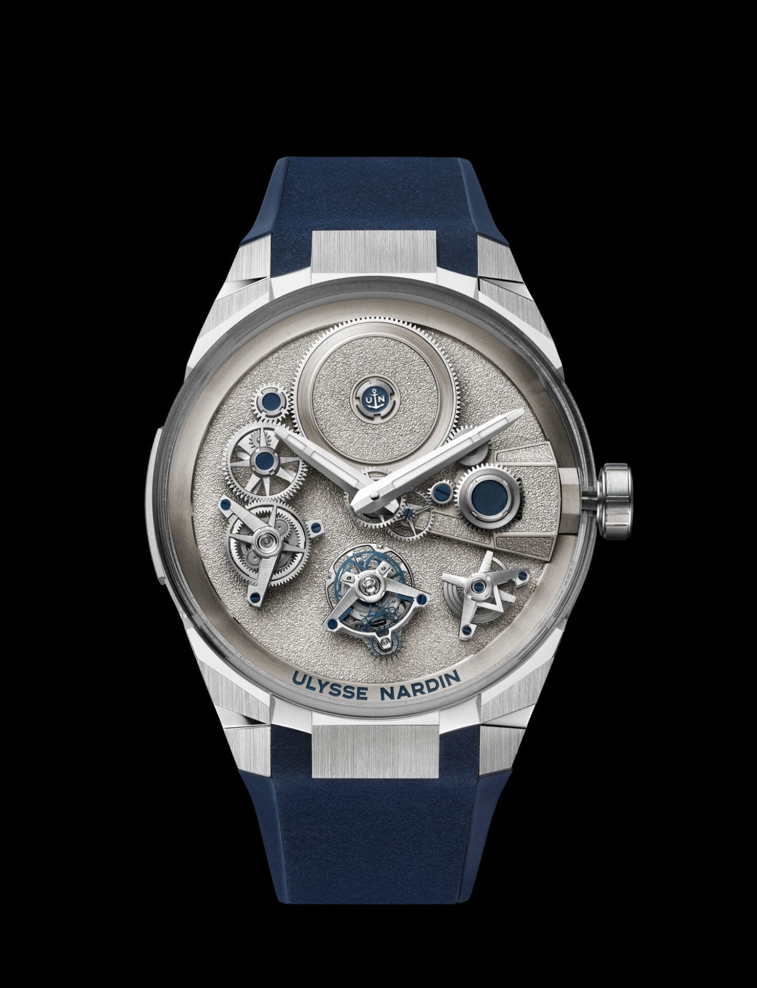 The centrepiece of the watch is its visually confounding layout. Within an ultra-glass sapphire crystal case—hollowed from a single block for seamless visibility—key components such as the tourbillon, power reserve display, and flying double-barrel appear to levitate. These elements are not only aesthetic marvels but are feats of engineering precision. At 6 o’clock sits the award-winning Ulysse Anchor Constant Escapement tourbillon, which delivers consistent power through a blade-spring system so delicate, each spring is thinner than a human hair.