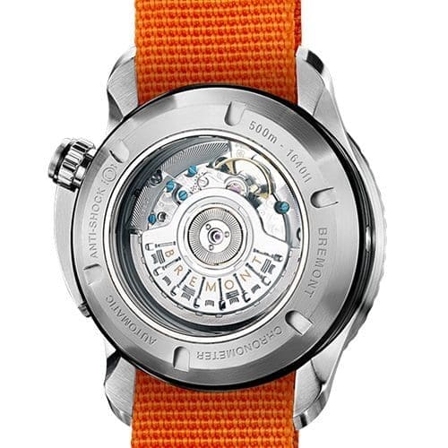 Ben also “felt strongly” that the Endurance should have a transparent case-back to view the beautifully finished Bremont movements. So, Bremont designed a new back that was robust enough to enable the watch to reach depths of 500 m and still be able to function in the rigorous climatic conditions of the Antarctic plateau. It also features new contemporary styling on the applied indexes and comes on an orange nato strap.