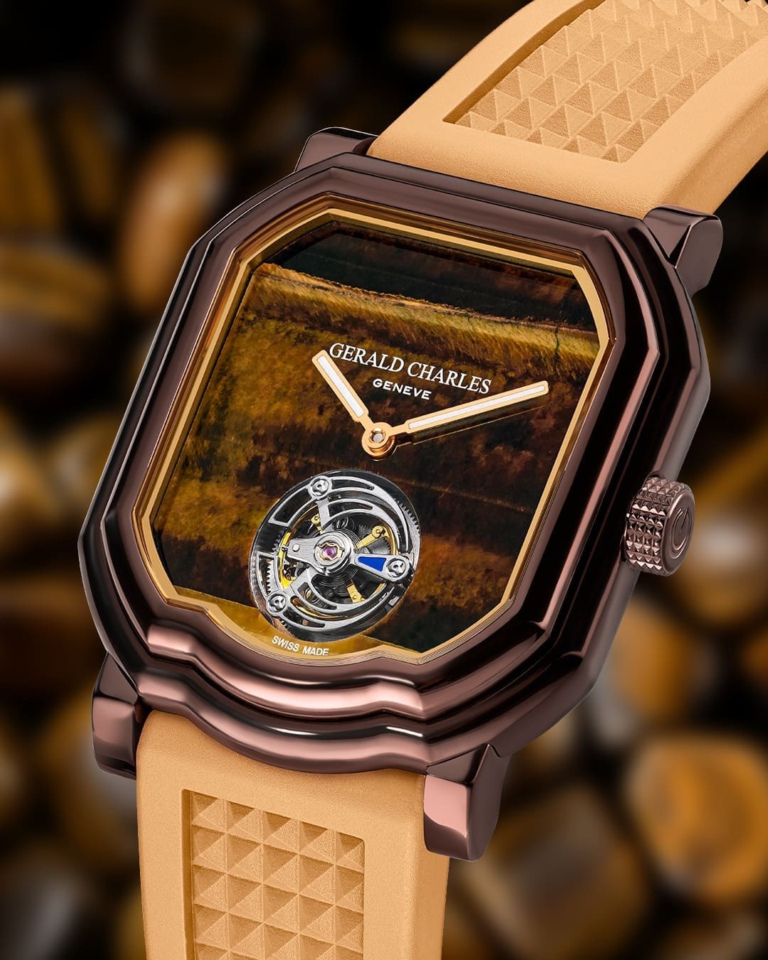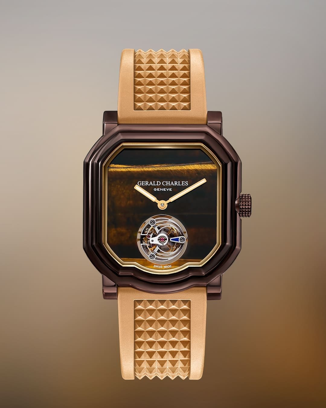 At first sight, the glimmering Tiger’s Eye dial becomes the soul of the timepiece — an arresting natural stone known for its golden chatoyancy and hypnotic depth. Historically admired in 1970s watchmaking and jewellery, the material takes on a contemporary expression through Gerald Charles’s refined technical interpretation. Each dial is carefully carved using diamond-tipped tools and shaped through a meticulous selection process that ensures only the most structurally sound, visually harmonious pieces are chosen.