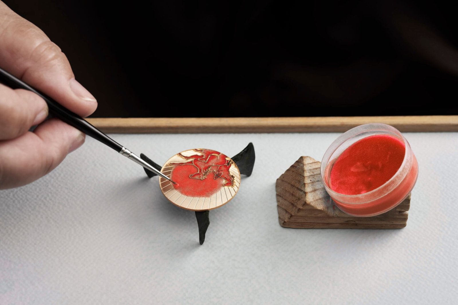 Housed in a 43 mm pink gold case, the Eternity Edition features matching Three Gold Bridges in warm tonal harmony. The red Grand Feu enamel dial delivers a bold, auspicious hue traditionally linked with celebration and vitality. Decorative sunray and circular guilloché patterns are applied by hand using a traditional rose engine lathe, adding dimensional depth and luminous texture.