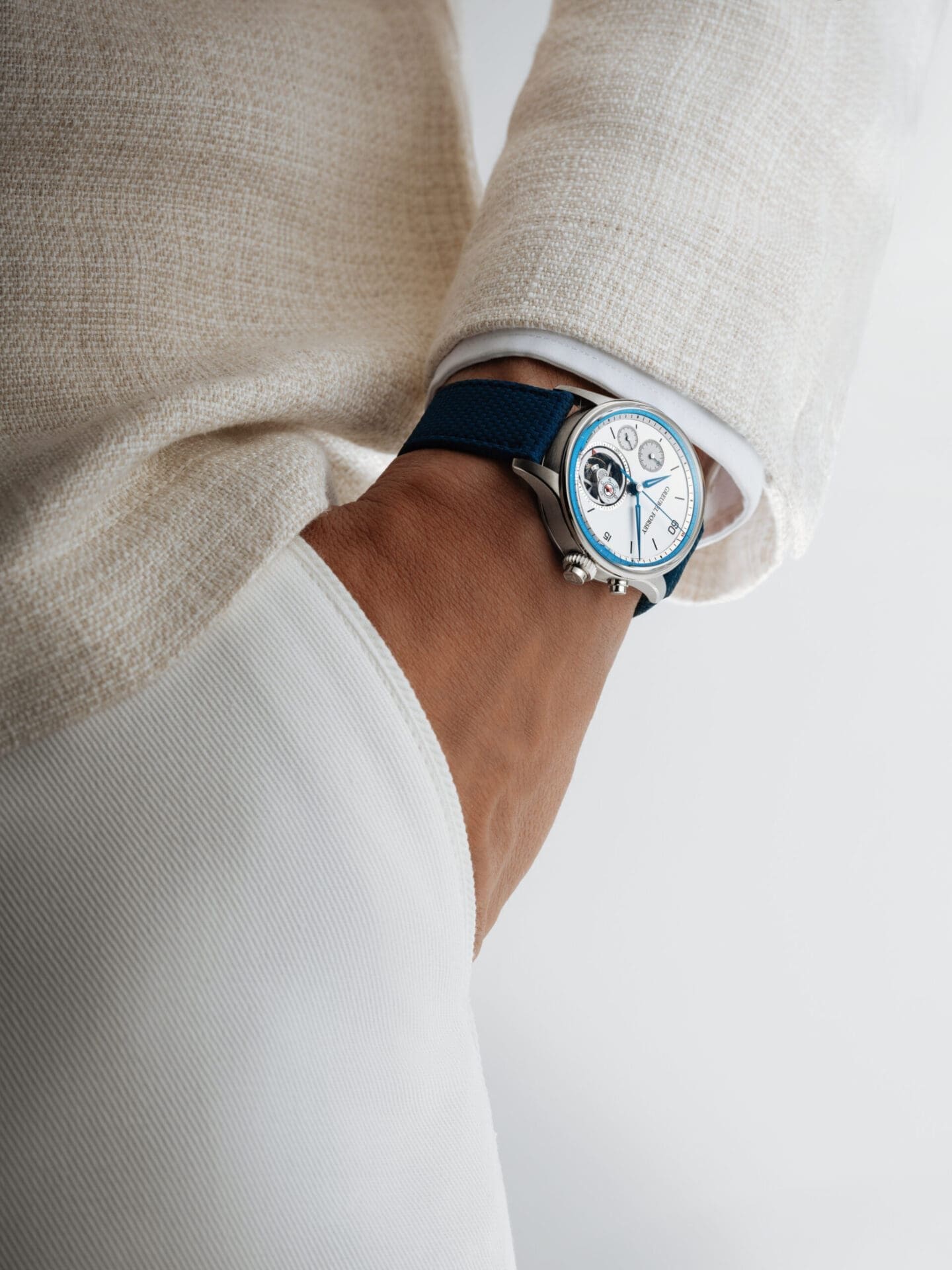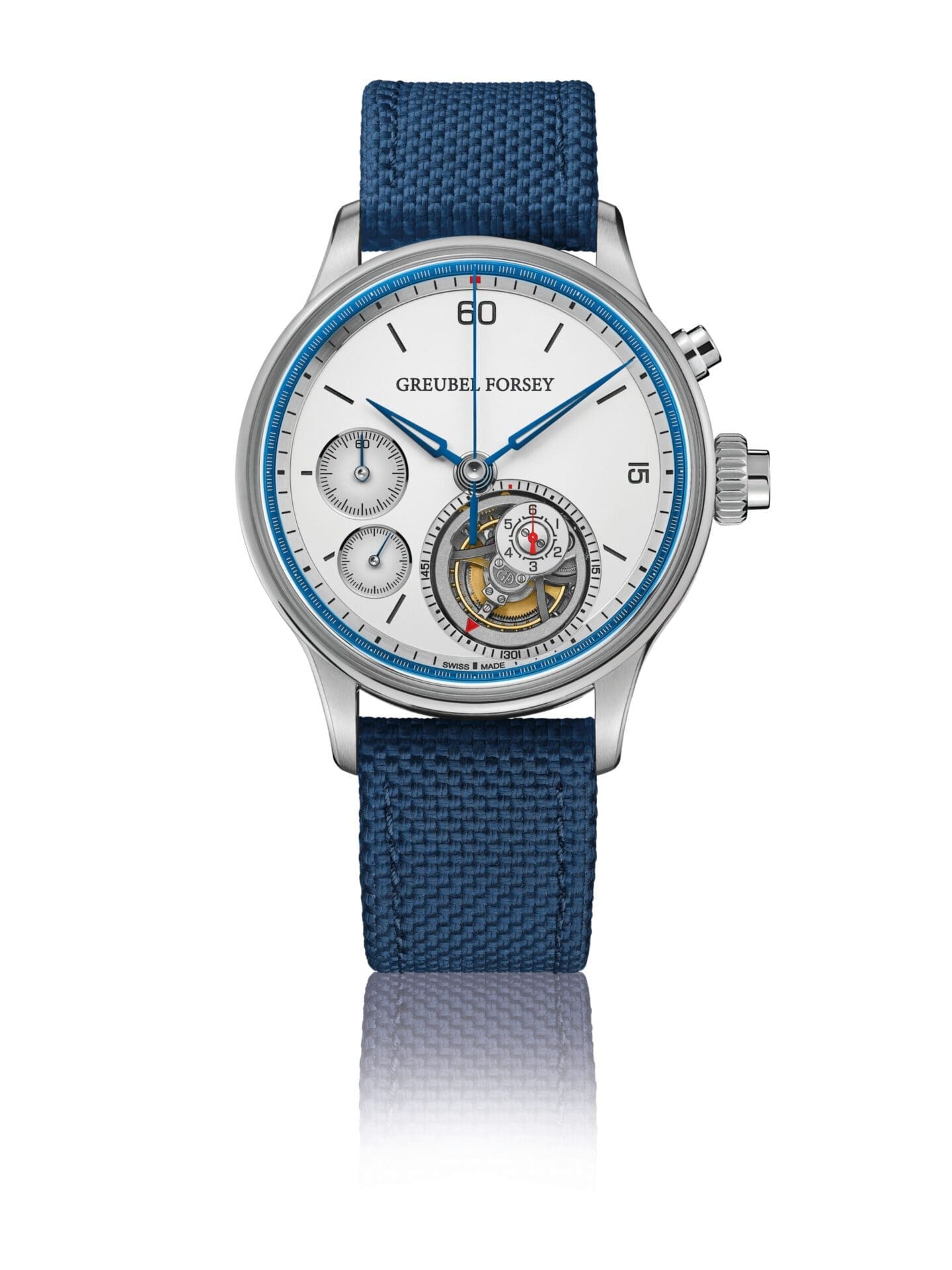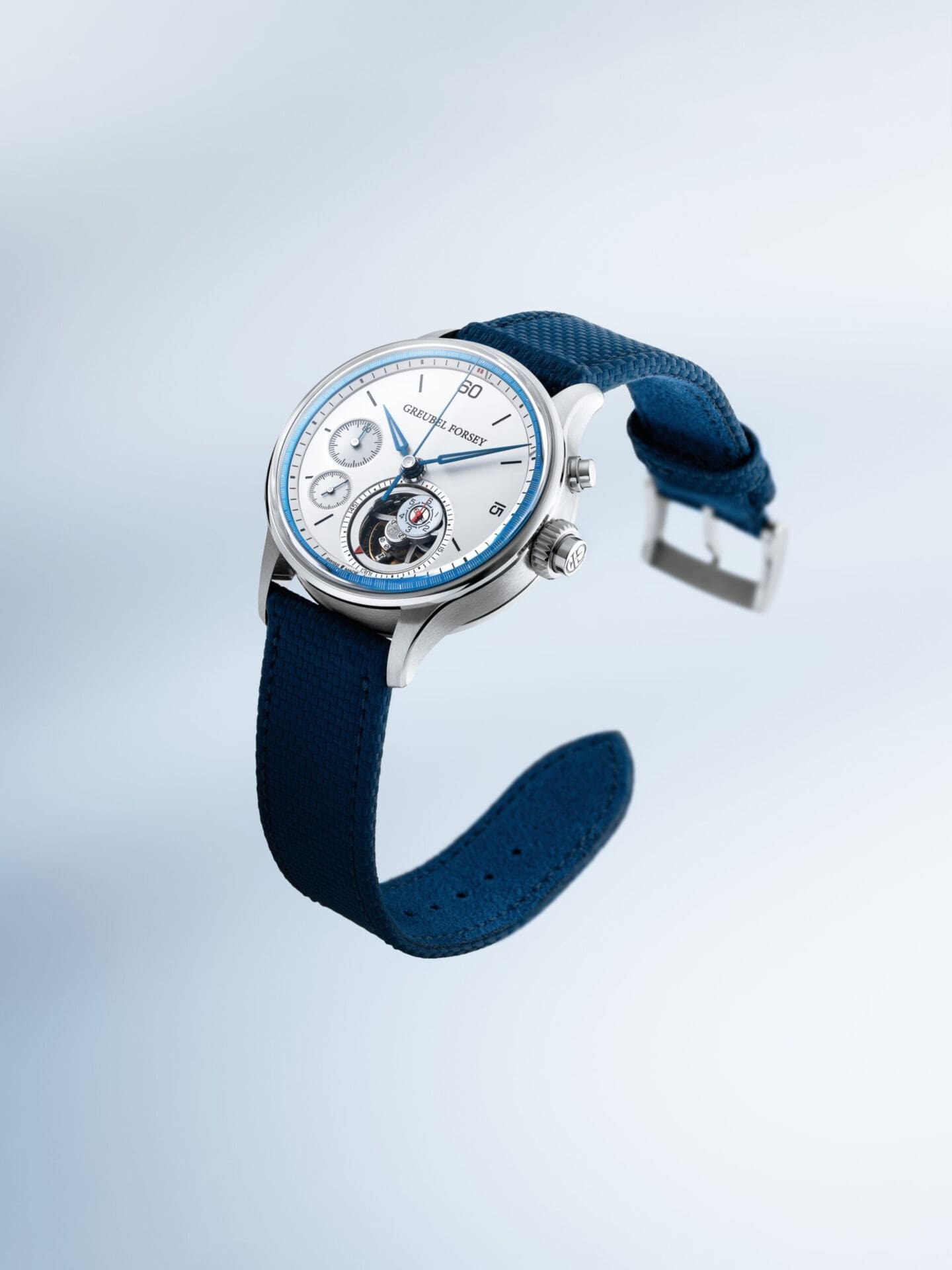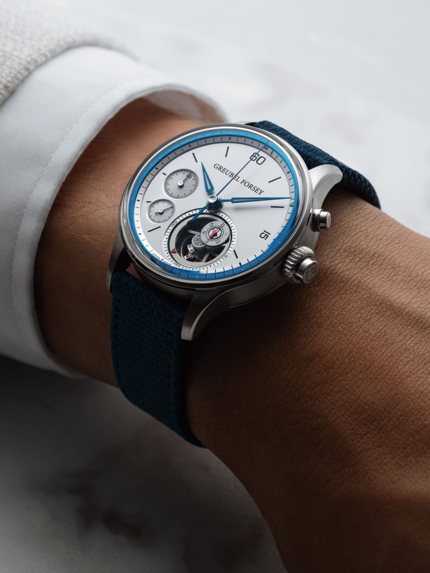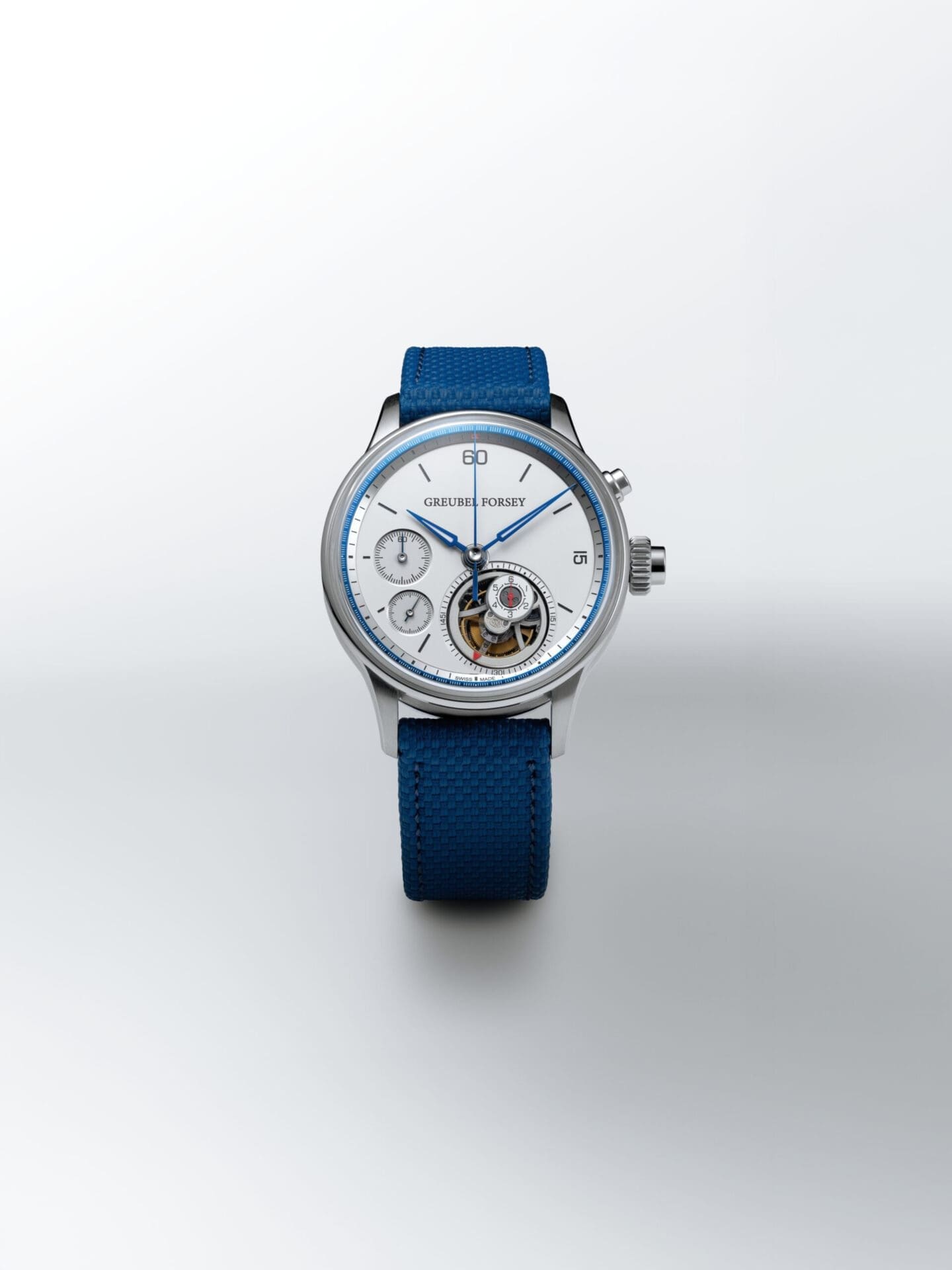 Crafted entirely in white gold, the watch departs from the tantalum-accented anniversary edition and asserts a new architectural character. A rhodium-finished gold dial with a blue minute track, blued steel hands, and a crisp white foudroyante dial create a strikingly legible composition. The tourbillon aperture adds depth and movement, while a textured blue rubber strap anchors the design with a contemporary touch.