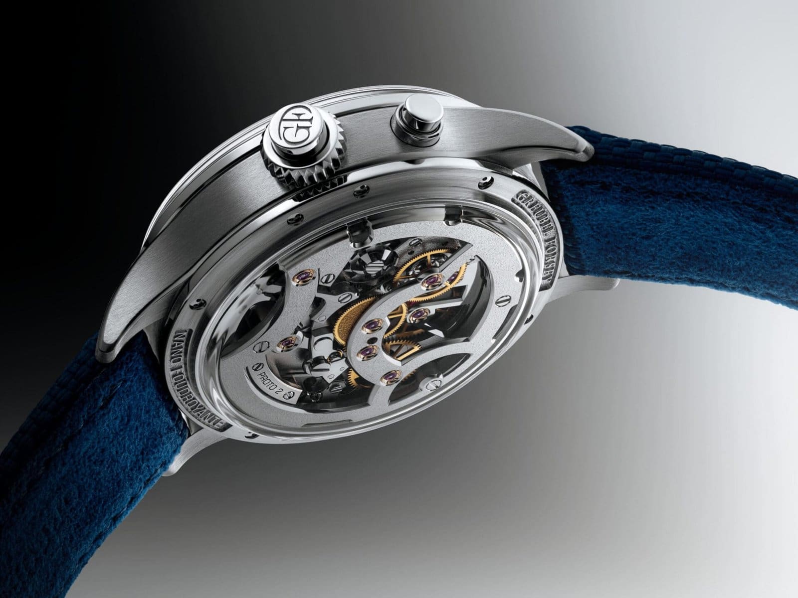 At its core lies a breakthrough in nanomechanics. Traditional foudroyante mechanisms consume around 30 microjoules per jump; the Nano Foudroyante requires just 16 nanojoules — an energy reduction of 1,800 times. The result is a foudroyante hand that divides each second into six precise jumps, rotating once per second in harmony with the 3Hz balance wheel. This efficiency was achieved not with additional gearing, but with an ultra-minimal series of low-inertia wheels that reshape how energy can be distributed within a mechanical movement.