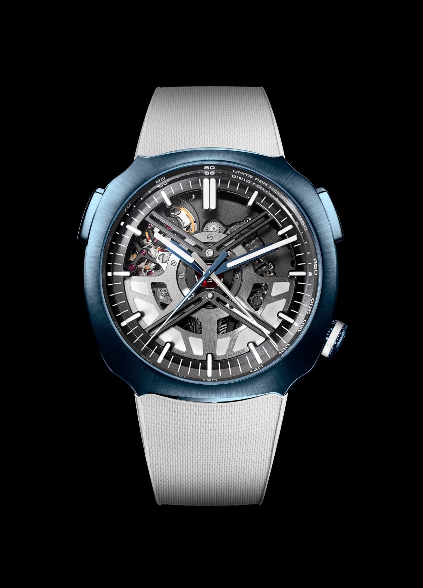 Every element of the watch pays tribute to racing: V-shaped bridges echoing suspension arms, a skeletonised rotor inspired by Alpine’s A110 wheel rims, and a central bridge sculpted in the shape of a driver’s helmet. The 42.3mm steel case features a striking blue PVD finish and houses a double-barrel movement with a 72-hour power reserve, resting on an integrated white rubber strap. It’s as much a tribute to high-speed precision as it is to collaborative design done right.