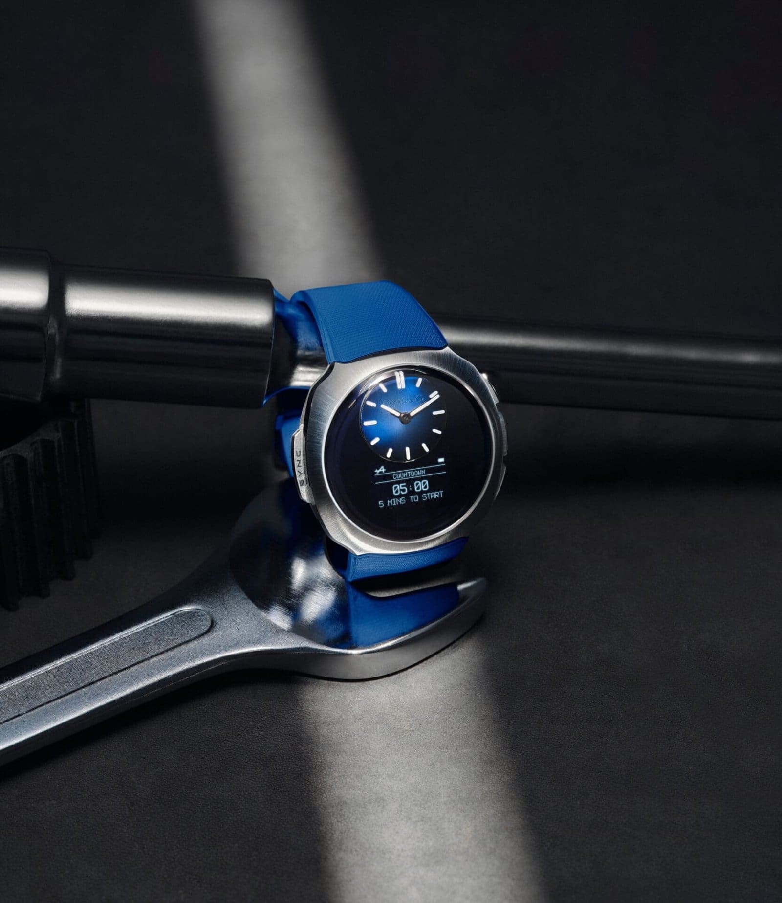 Its discreet sapphire display remains dark until activated, revealing a high-performance digital suite that includes a split-seconds chronograph, perpetual calendar, world time with country selector, and a dedicated “F1 mode” featuring race countdowns and alerts. Even in digital form, Moser honours its watchmaking roots with a small Funky Blue fumé dial at 12 o’clock, anchored within a 42.6mm steel case and paired with a blue rubber strap. With a one-year battery life in time-only mode and Bluetooth synchronisation, this connected piece is built to endure the rigours of motorsports without sacrificing craftsmanship.