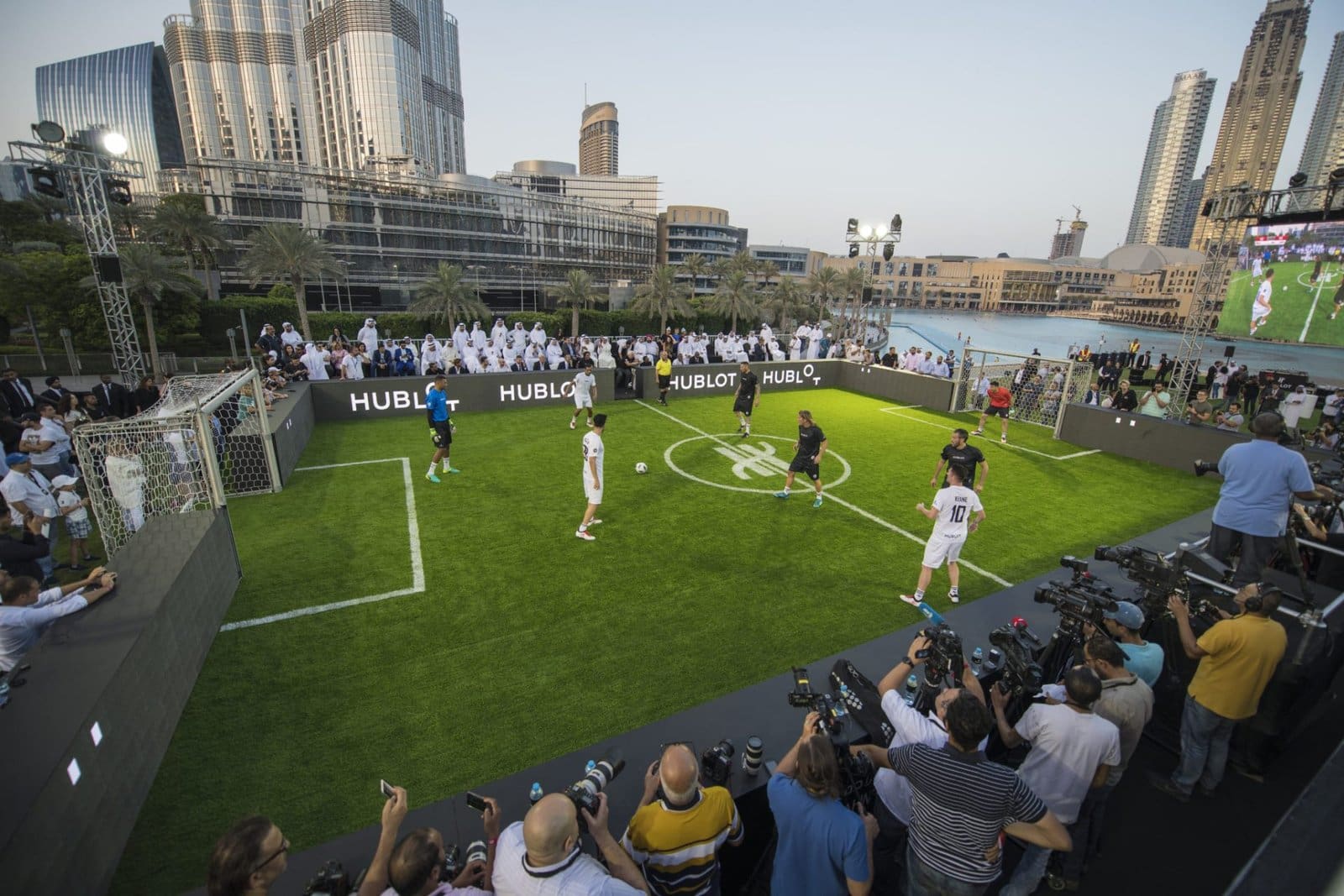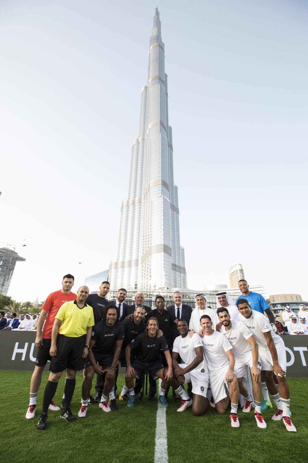 To celebrate this remarkable watch, Hublot joined hands with its U.A.E. partner, Ahmed Seddiqi and Sons to organise ‘The Match of Friendship’ at the Dubai Opera Hanging Garden at the base of the Burj Khalifa. It was a one-match, five-a-side football game featuring some of the greatest names to have treaded on a football pitch. One team was coached by none other than Pelé himself and featured Dida, Robbie Keane, Serginho, Marcel Desailly, and Majed Hassan. The opposing team was coached by Marcello Lippi and featured Marco Amelia, Marco Materazzi, Gianluca Zambrotta, Christian Karembeu, and Michel Salgado. The referee obviously wore a Big Bang Referee 2018 which gave the referee notifications from Goal Line Technology live throughout the match. This unique experience was topped by a cocktail reception at the same iconic location, where guests mingled with the players.