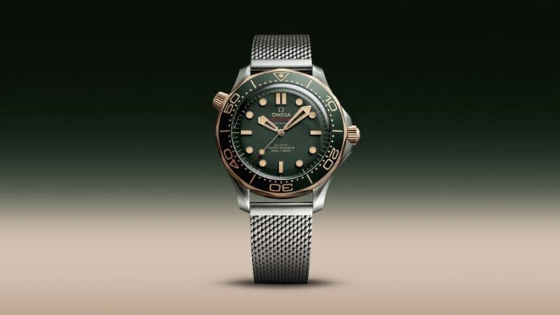 Drawing inspiration from the Seamaster Diver 300M 007 Edition, famously worn by James Bond in No Time To Die, this model takes a detour from the collection’s familiar ceramic styles. Instead, the watch features a domed sapphire crystal, exuding a subtle vintage appeal. The green aluminium dial and signature mesh bracelet echo the timeless elegance and adventure of the Bond legacy.