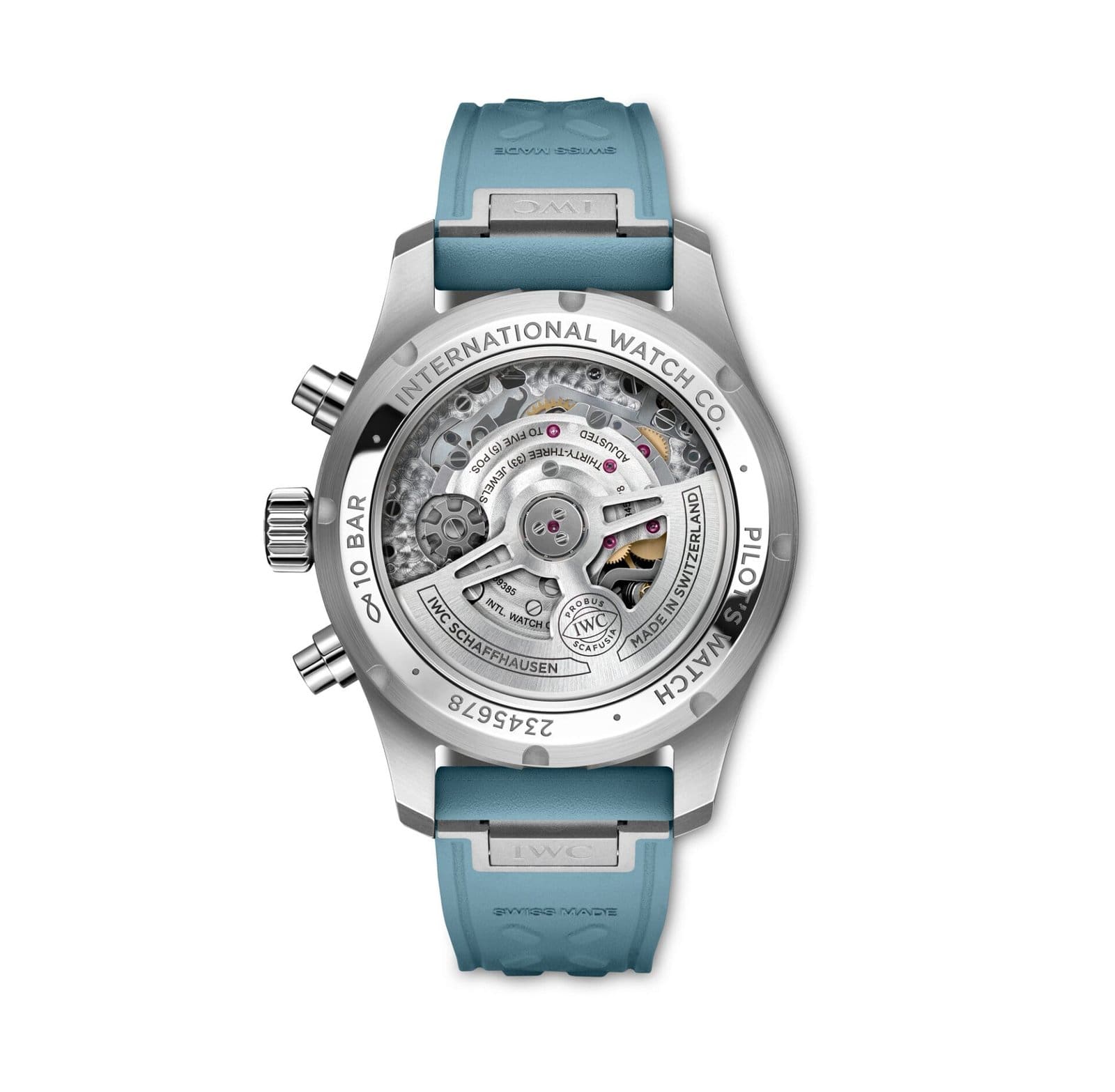The light blue theme is also carried into a new stainless steel edition (Ref. IW388117), marking IWC’s first use of a Pantone® color on steel. This model features a stainless steel case paired with the same vibrant blue dial and strap, rhodium-plated hands, and an open sapphire case back offering a peek into the finely finished movement within.
