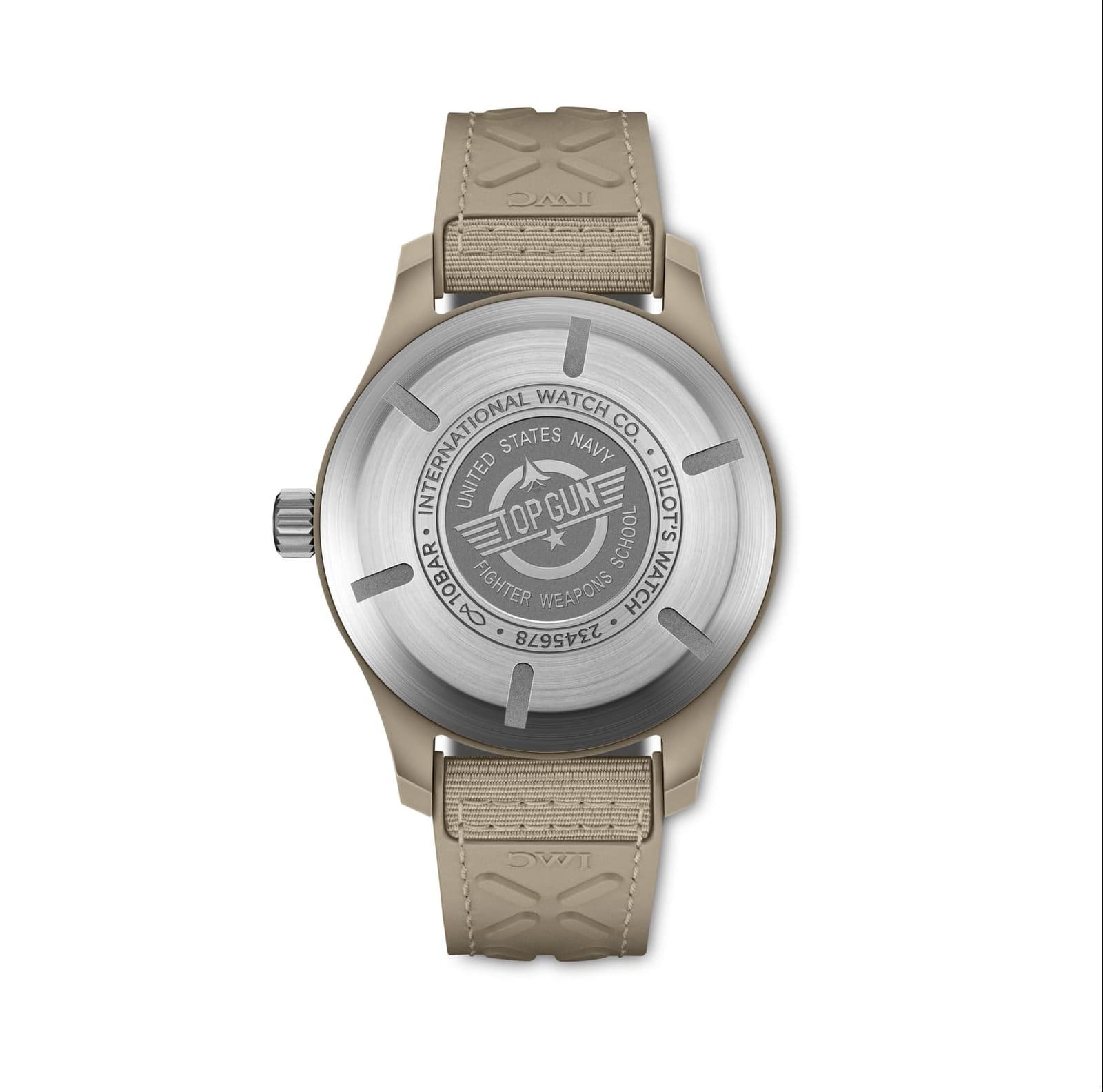 The monochrome harmony extends to a beige rubber strap with textile inlay, secured by a robust titanium pin buckle. Adding to its visual strength and endurance, the caseback is also titanium and engraved with the iconic TOP GUN insignia—reinforcing the watch’s roots in elite naval aviation. Every detail speaks to the fusion of form and function, of heritage and cutting-edge innovation.