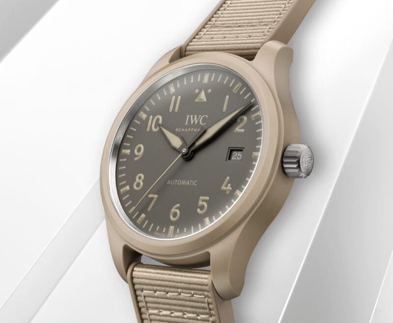 The watch’s ceramic case is a testament to IWC’s nearly four decades of ceramic expertise. Made from zirconium oxide and metallic oxides, the ceramic blend achieves its distinct hue through a meticulous sintering process. Known for its extreme hardness and scratch resistance, the material stands up to the rigors of both performance and everyday wear. With this newest reference (IW328106), the Mojave Desert color reaches its most wearable form yet, compact at 41mm without sacrificing its bold character.