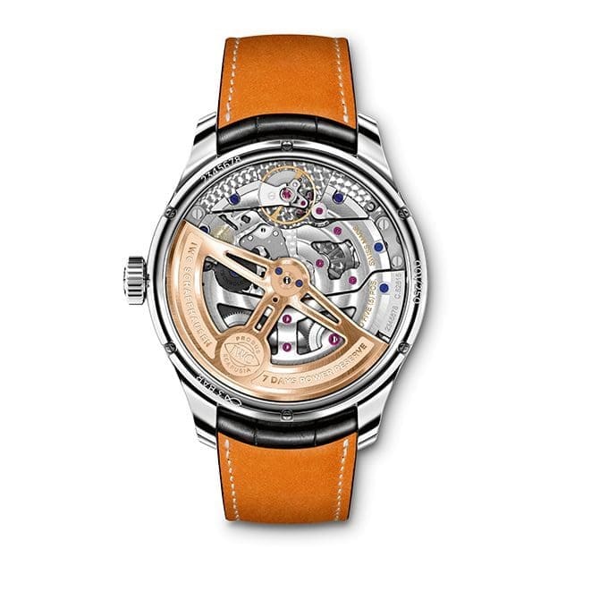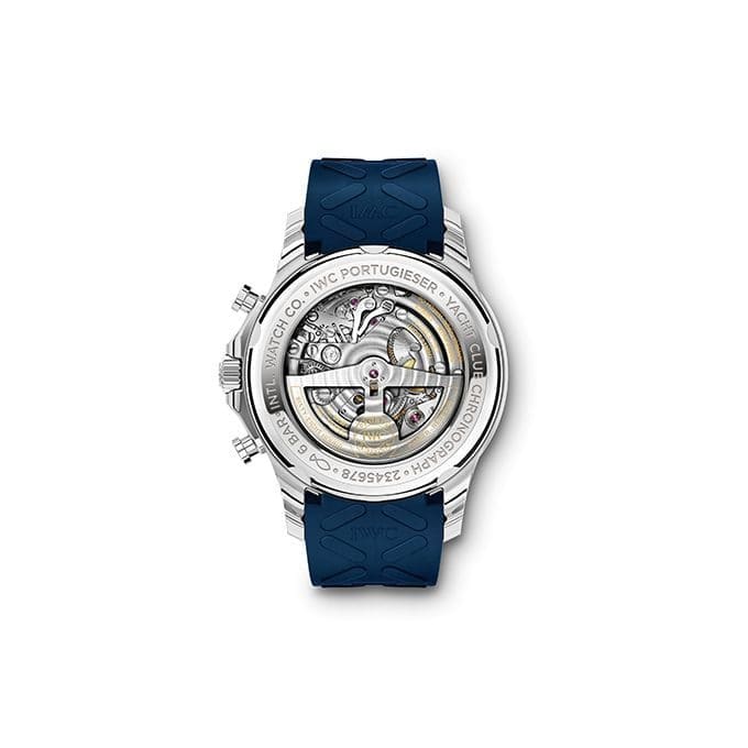 It is powered by the rugged IWC-manufactured automatic, self-winding 89361-calibre movement which has a 68 hours Power Reserve and features 38 Jewels, Côtes de Genève and perlage. Water-resistant to 6 bar, the chronograph reveals its sporting qualities with a flyback function, an additional flange with a quarter-second scale for measuring short stop times and an analogue display for longer stop times on a subdial.