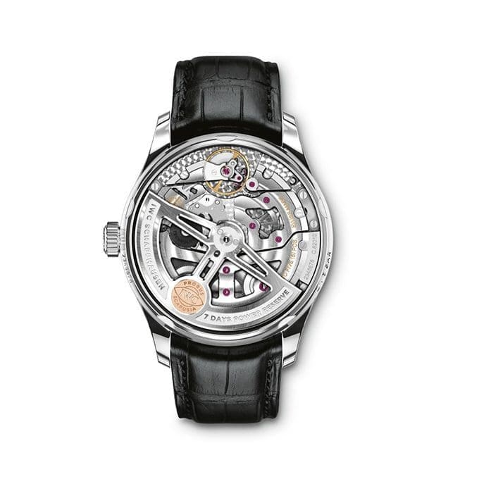 The newest addition to the family combines a silver-plated dial in a stainless-steel case with rhodium-plated hands and appliqués. The watch is powered by the IWC-manufactured 52010 calibre movement. Featuring an automatic Pellaton winding system fitted with components made of virtually wear-free ceramic, the rotor’s oscillating weight is equipped with an 18-carat gold medallion and builds up a power reserve of seven days in two barrels. The mechanical inner workings can be admired through the see-through sapphire-glass back. The watch is worn on a black alligator leather strap.