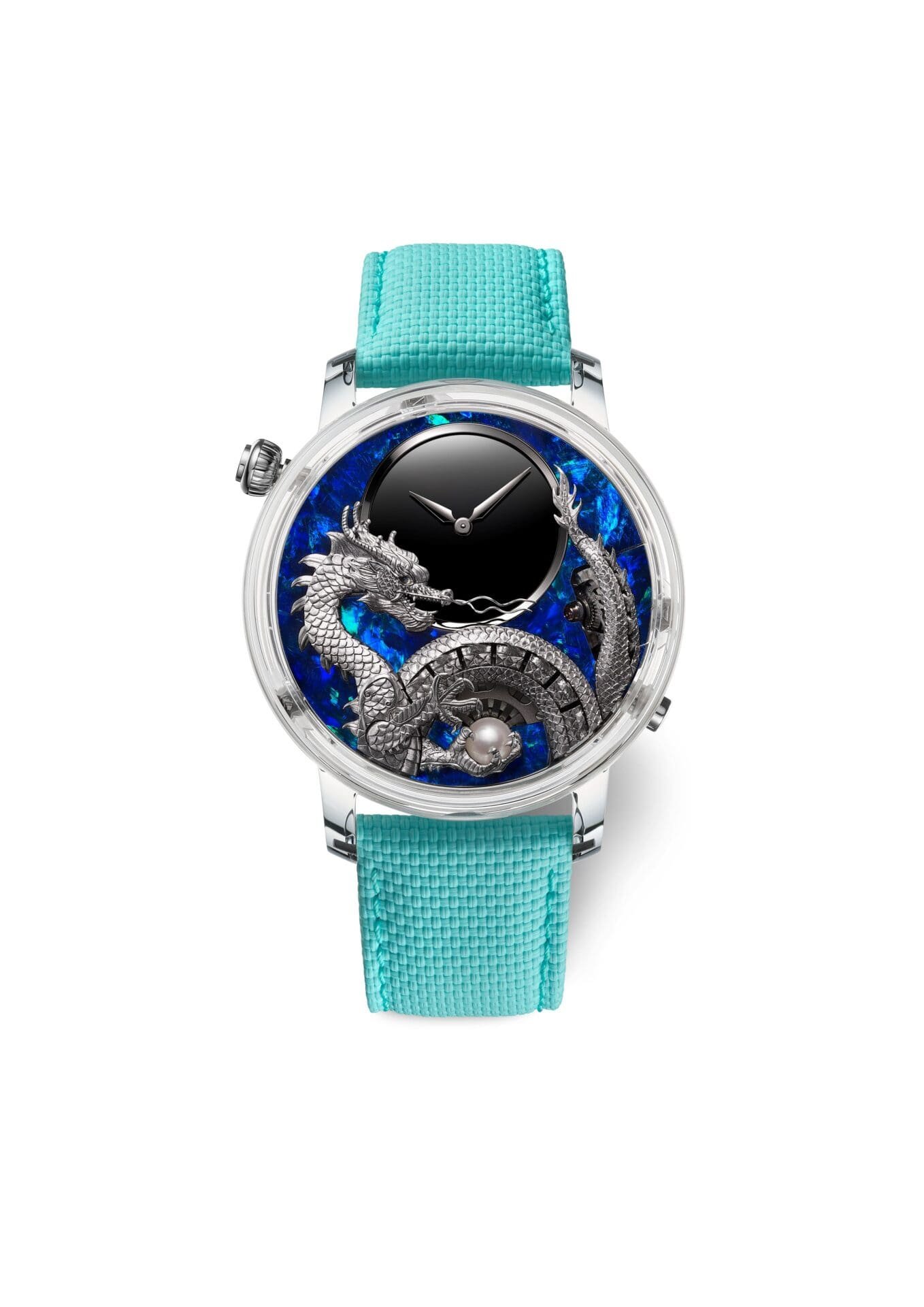 Comprising sixteen independent and randomly activated animations, the dragon moves with hypnotic fluidity. Its spine undulates, eyes and jaw open and close, its tongue flickers, the crest rises and falls, and its claws grasp a rotating Akoya pearl. Cultivated using specialised Japanese techniques, the pearl adds both symbolic and tactile richness, marking a rare horological first while reinforcing the piece’s cross-cultural narrative.