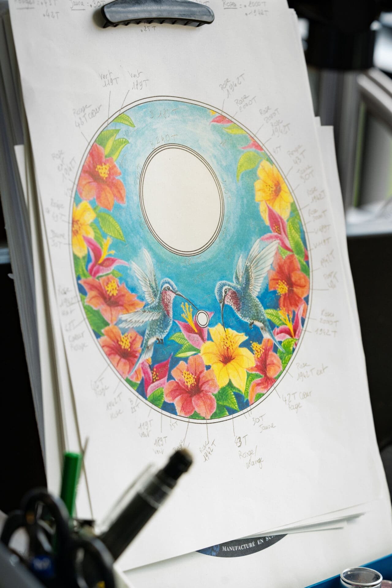 The dial is a miniature canvas crafted entirely by hand, featuring two hummingbirds hovering over hibiscus flowers. Executed using refined miniature painting techniques, the birds appear almost sculptural, rising subtly above the landscape despite being painted to an extraordinary thinness. Every floral detail, from petals to pollen grains, is engraved and enamelled with meticulous precision.