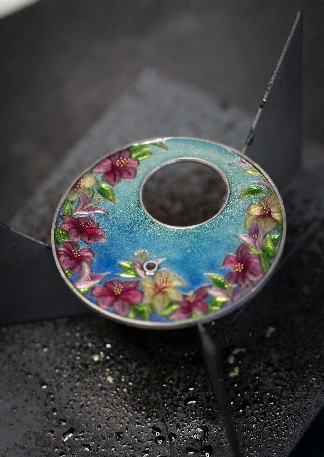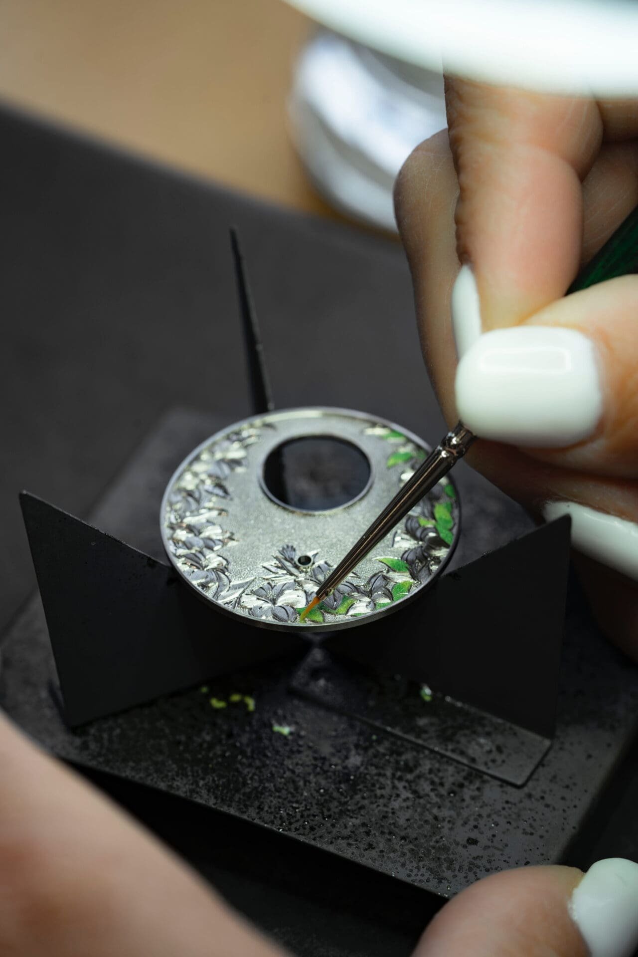 Colour plays a central role in the watch’s visual depth. Vivid yet nuanced shades are achieved through multiple firings using traditional Grand Feu enamelling, a demanding process that leaves no margin for error. Graduated tones flow seamlessly across the dial, from the warm chromatic range of the blossoms to the soft transitions of light in the sky.