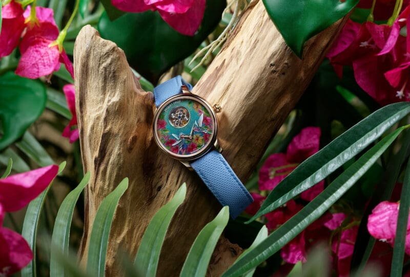 Rooted in the Enlightenment-era fascination with botany and natural sciences, the watch draws inspiration from the maison’s earliest works, where birds and flora adorned pocket watches, automata, and objets d’art created to captivate royal courts. The hummingbird, a recurring symbol in Jaquet Droz’s visual universe since the 18th century, returns here as a living motif frozen in time.