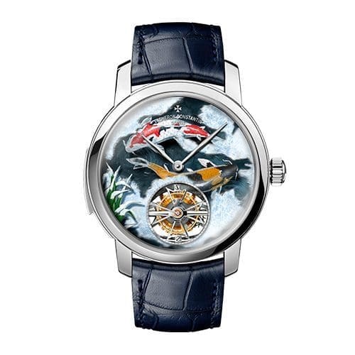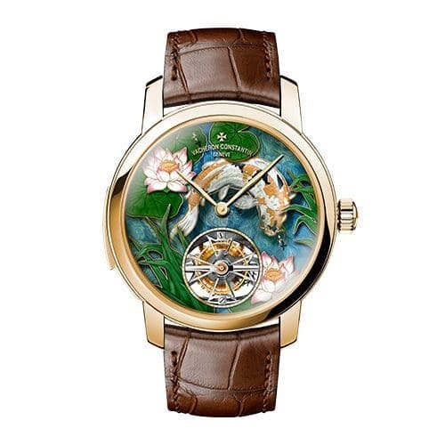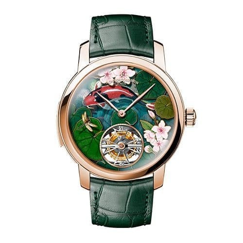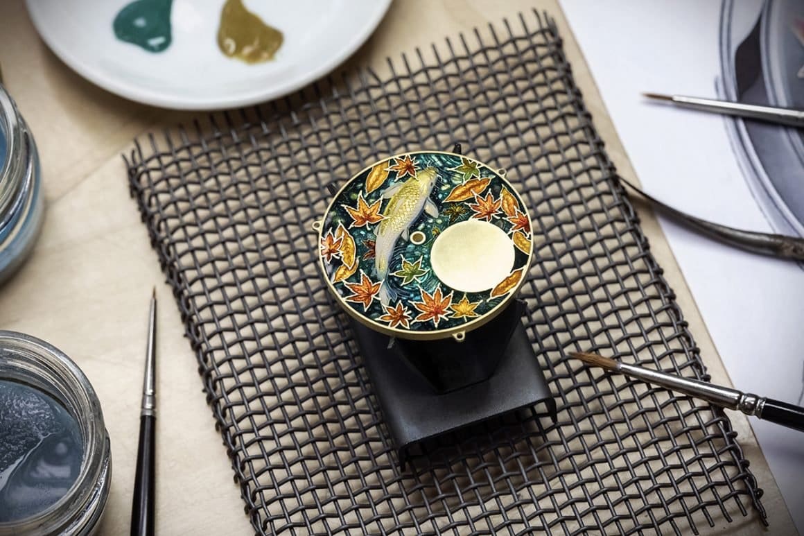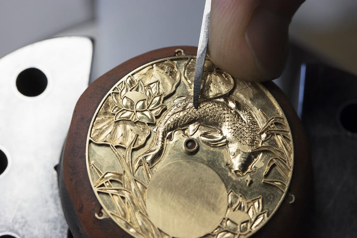 Depicting the undulations of a carp swimming in a decor graced with seasonal colours, the dials are to artistic crafts what the minute repeater is to mechanical horology: a demonstration of exceptional expertise. Masterpieces of miniaturisation, these watch faces are engraved using the bas-relief technique to highlight the richness of the scenography. No less than 60 hours per dial are required to engrave the material with a burin in order to create a depth effect based on differences in height of up to 1.35 mm. The enameller then takes over with a palette of 12 colours applied using the champlevé technique, which involves embedded the enamel in the cavities created by the engraver. Around 15 firings are then necessary to achieve the desired colours by applying successive layers. These high-risk operations must be carried out with the greatest care to prevent multiple firings from cracking or dulling the enamel.