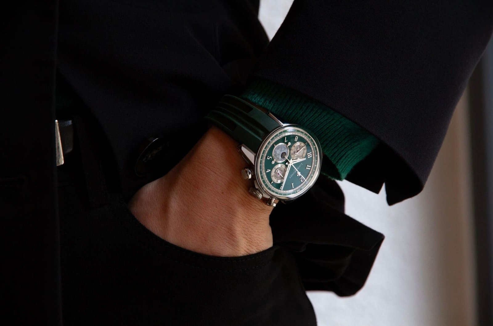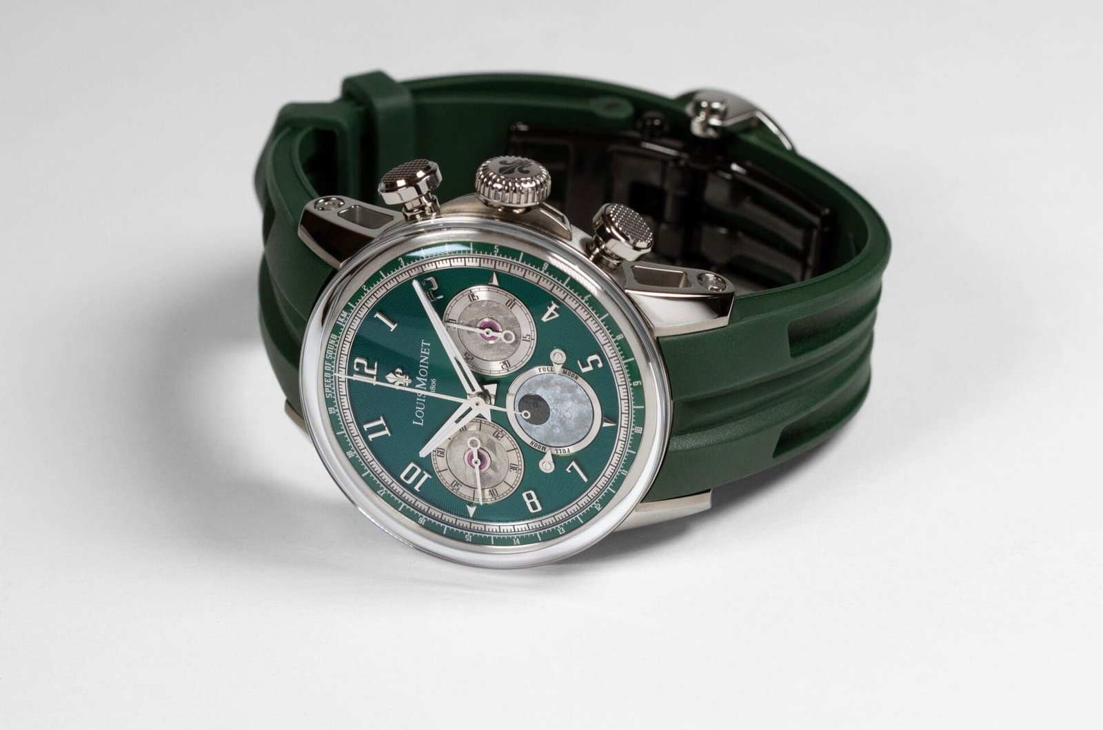 With the Speed of Sound, Louis Moinet returns to one of Swiss watchmaking’s most storied calibres, the Valjoux 88, transforming it into three contemporary masterpieces limited to just three pieces each. Presented in vivid shades of black, green and orange, these ultra-rare editions bridge the romance of a 1940s movement with bold, modern design language.