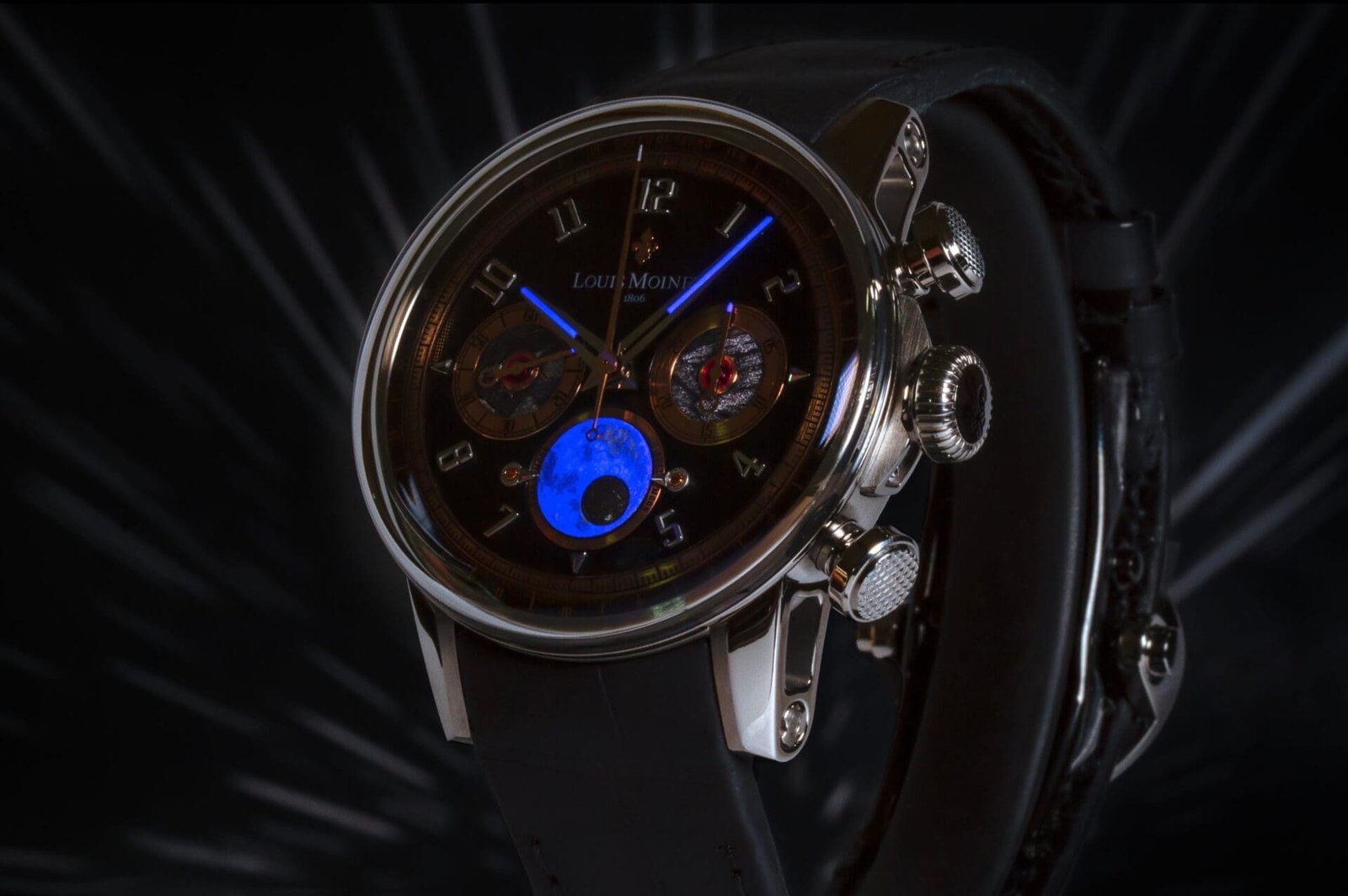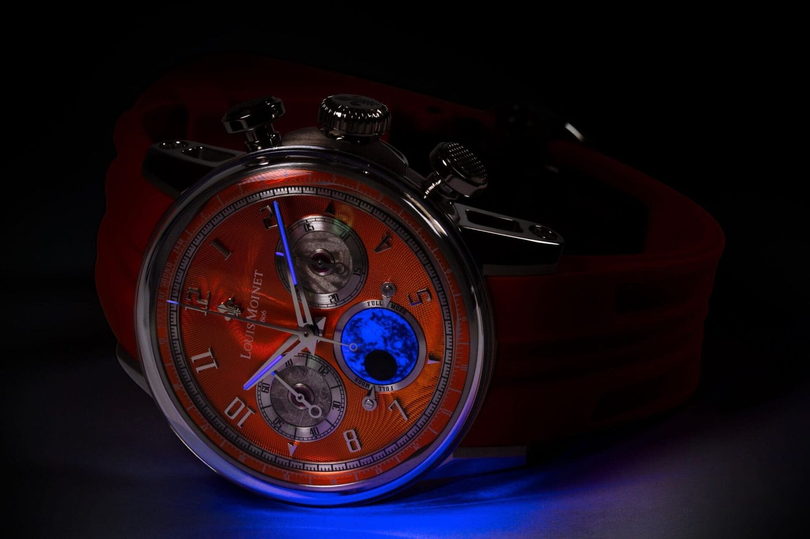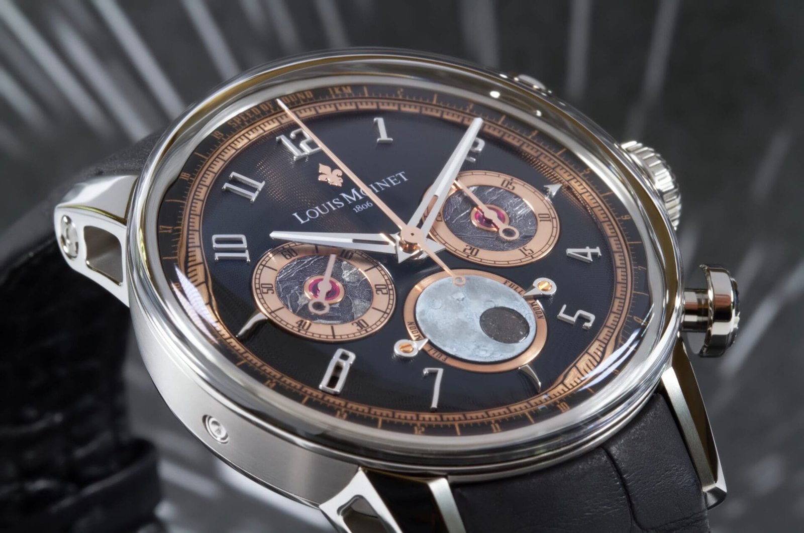 At the heart of each watch beats the historic Valjoux 88, meticulously modernised by the master watchmakers at Les Ateliers Louis Moinet. Its most poetic reinvention lies in the moon-phase display, where a domed lunar disc is hand-painted with luminescent detail and inset with a fragment of Dhofar 457, a rare lunar meteorite sourced from a crater. Two opposing pointers at 3 and 9 o’clock indicate the full moon when aligned with the meteorite fragment, creating a display unseen in traditional watchmaking.