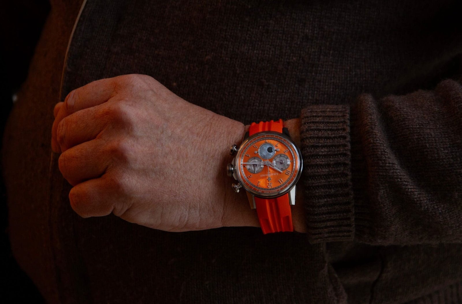 Turn the piece over and the transparent caseback reveals hand engraving in a classical motif of floral curves and delicate scrolls reminiscent of lace. The decoration elevates the movement into a decorative canvas, affirming Louis Moinet’s dedication to ancestral crafts even within a resolutely modern context.