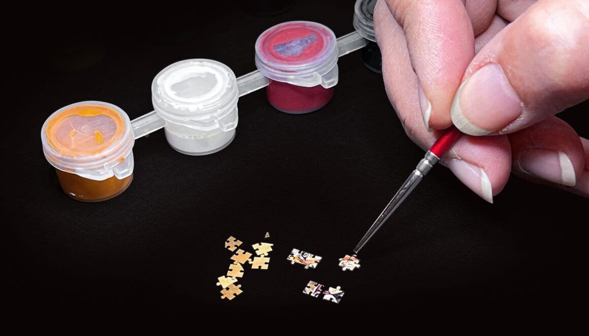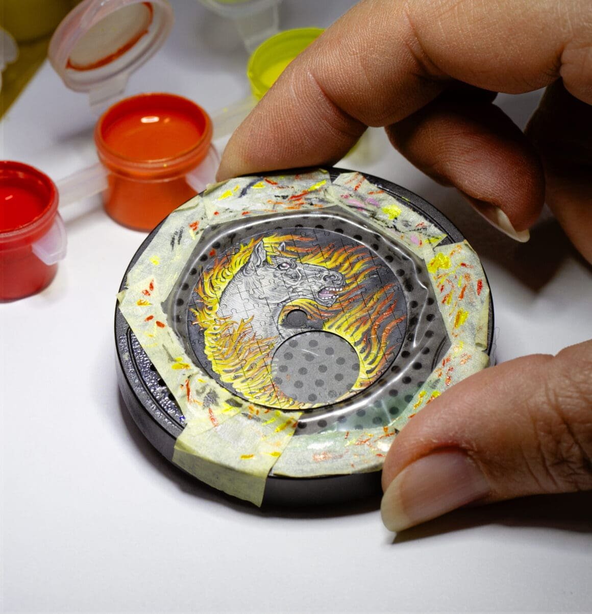Each element is meticulously dismantled, its edges individually painted in acrylic by hand, and then reassembled to create a seamless composition. The result is a vivid Fire Horse rendered in micro-painting, alive with motion and force.