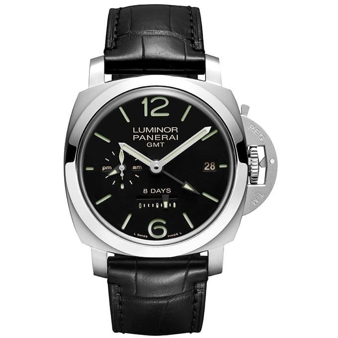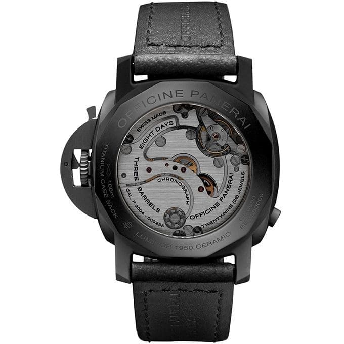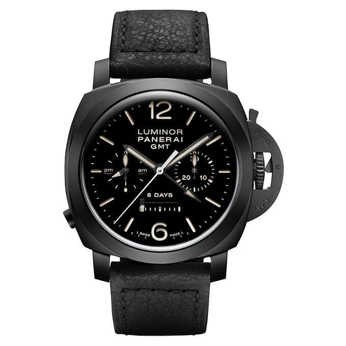 Panerai has two models using this calibre. The Luminor 1950 10 Days GMT Automatic Acciaio with a 44mm polished steel case, and the Luminor 1950 10 Days GMT Automatic Ceramica with a 44mm black ceramic case. Both feature a black dial.