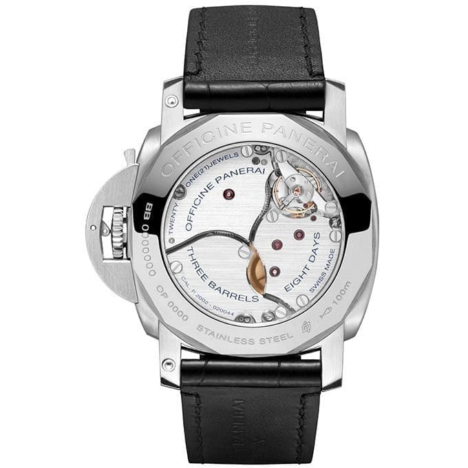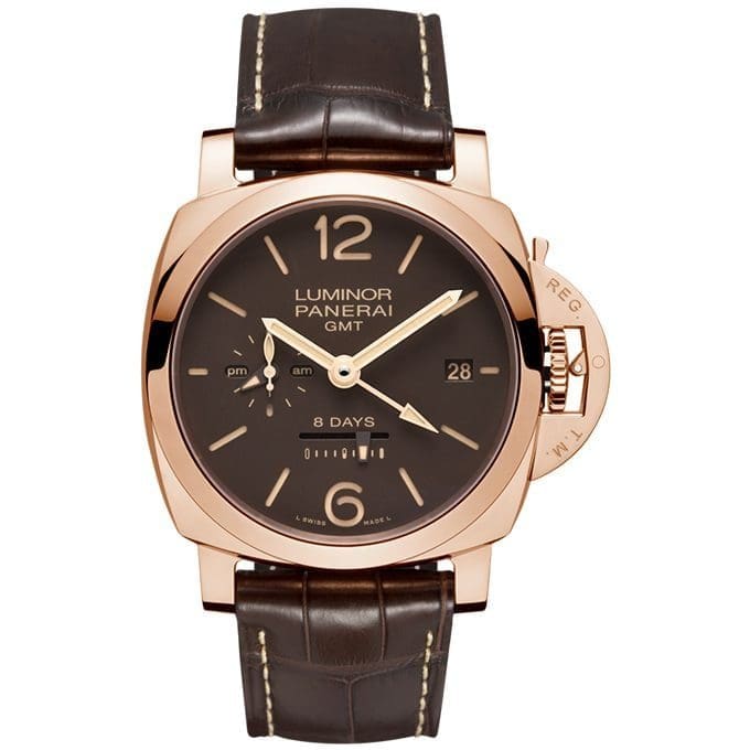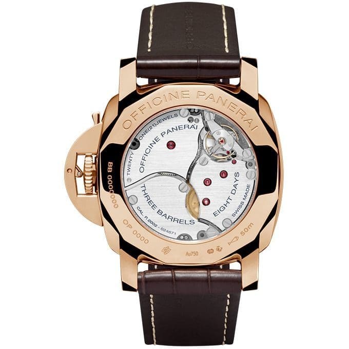 The predecessor to the P.2003 is the P.2002. This in-house patented design is a hand-wound calibre with a power reserve of 8 days. It consists of 247 components including 21 jewels and a thickness of 6.6 millimetres. Panerai has created two new models based on this calibre. One is the Luminor 1950 8 Days GMT Acciaio with a 44mm brushed steel case and a black dial with “Paris Hobnails.”. The other is the Luminor 1950 8 Days GMT Oro Rosso with a 44mm 18 ct. polished red gold case and a brown dial.