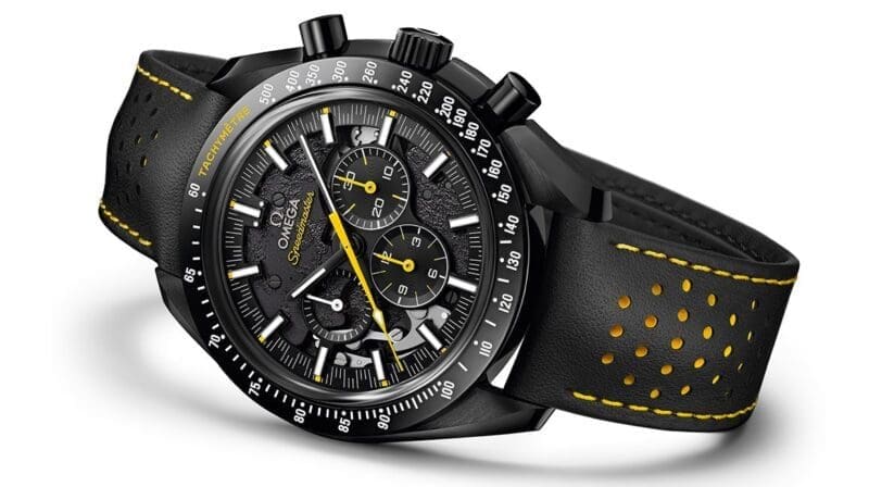 Omega has applied its popular “Dark Side of the Moon” innovation to the entire watch: black zirconium oxide ceramic. The dial has been expertly skeletonised to reveal the blackened movement inside. To contrast this dark tone, the brand has chosen chronograph hands that are varnished yellow, while the watch’s tachymeter scale and crown are filled with Super-LumiNova. The black and yellow theme extends to the perforated leather strap, which contains a section of yellow rubber through the middle.
