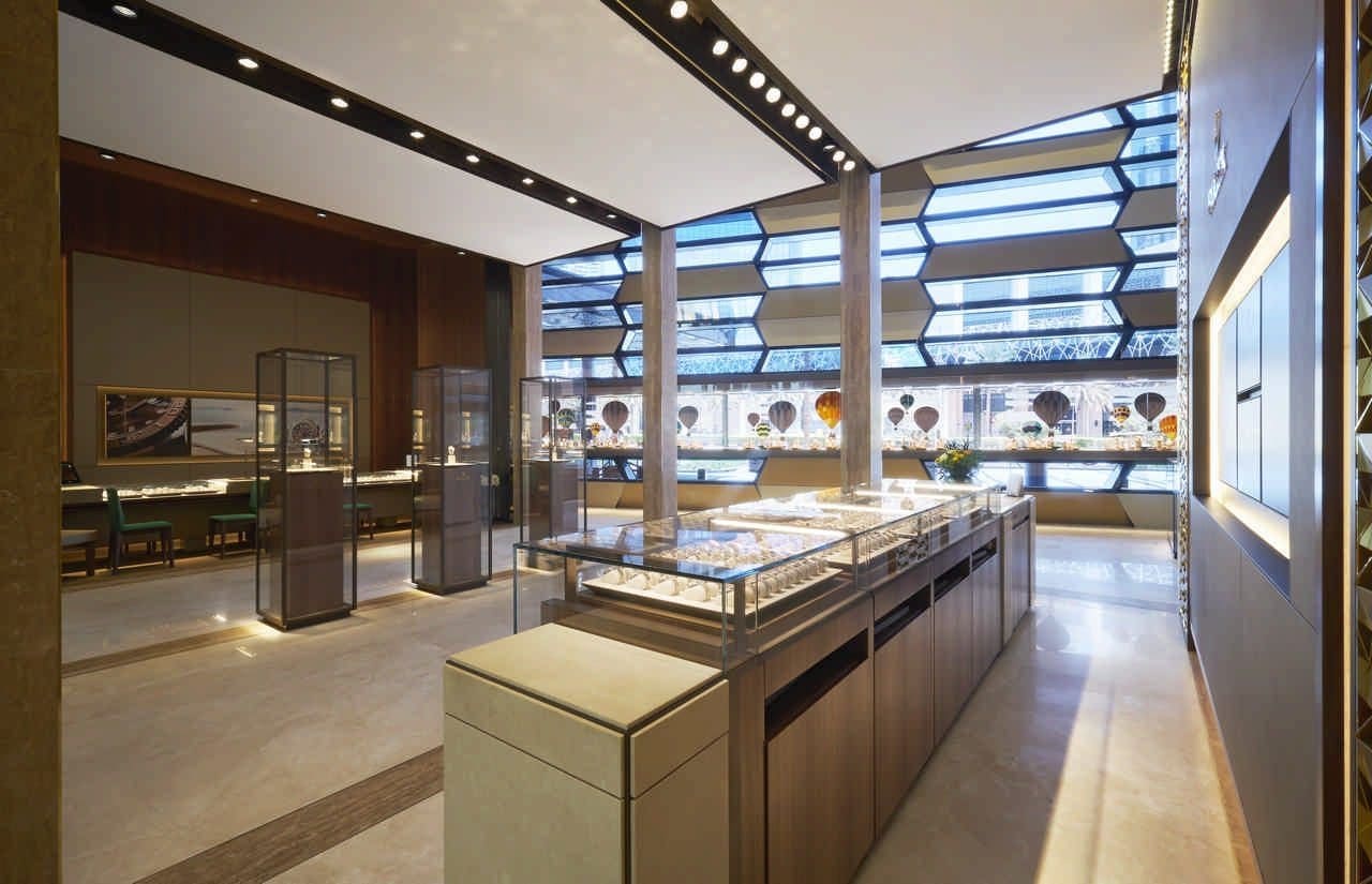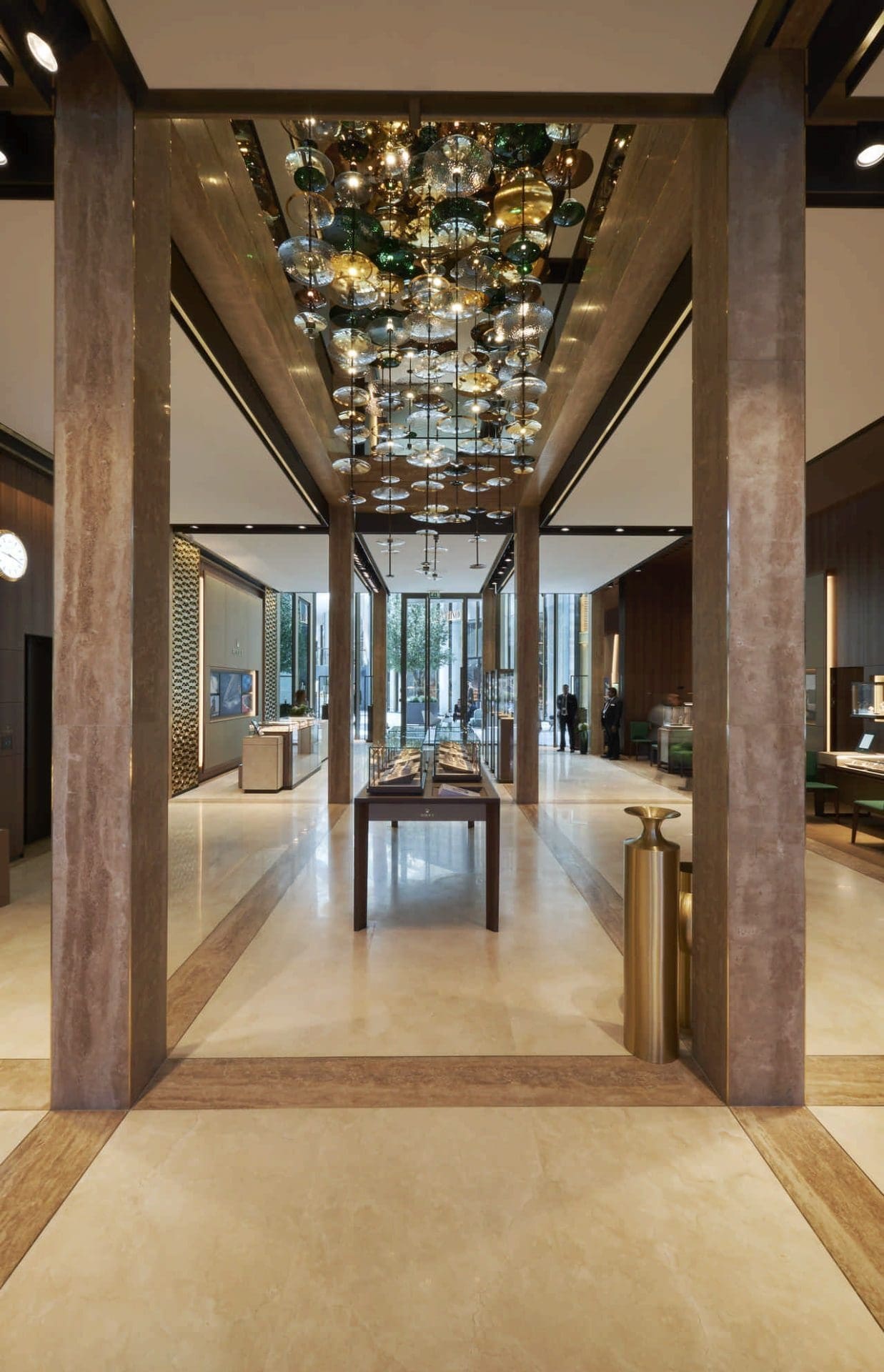 The interior space is dominated by a chandelier; a spectacular glass lighting installation that was specially designed and custom-made for the boutique. Handcrafted in the Czech Republic by glass specialists, it features layers of coloured glass which are inspired by the ‘Cyclops’ lens on Rolex watches that magnify the date display. As a result, the glass pieces on the chandelier also have a magnifying effect. The imposing chandelier illuminates the ground floor as well as the mezzanine floor above as they share an open space.