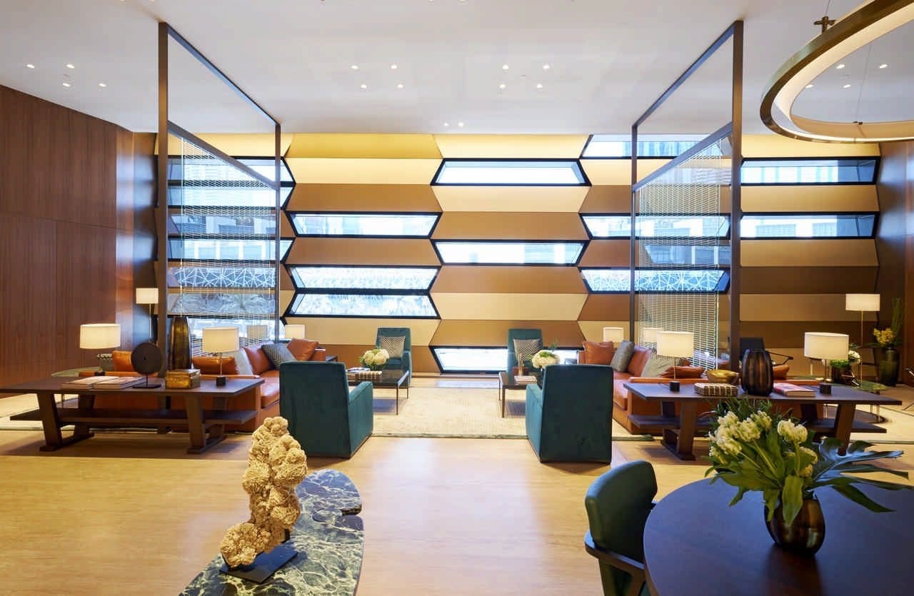 The chandelier is just one example of the many specially designed features present throughout the boutique. For example, the pillars made from Noce Travertine stone from Italy and covered in bronze. They add to the elegance of the space and also create a sequenced means of separating areas within the boutique. The wall panels that surround the room have gold elements which project the fluted bezel of a Rolex watch in 3D. The acoustics have been given careful attention to enhance the comfort of the customers. For the convenience of the patrons of the store, the mezzanine and third floors can be accessed by a lift.