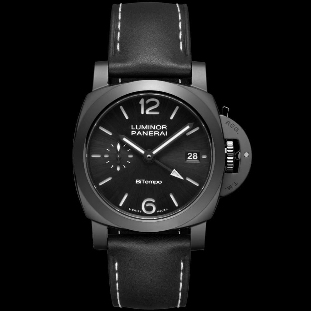 The dial remains true to the Luminor DNA, executed in deep black with Panerai’s signature sandwich construction. Luminous numerals and markers emerge with clarity, ensuring legibility across conditions. Subtle details, including the “BiTempo” inscription, nod to Italian roots while reinforcing the dual-time function. It is a composition of clarity, depth, and purpose.