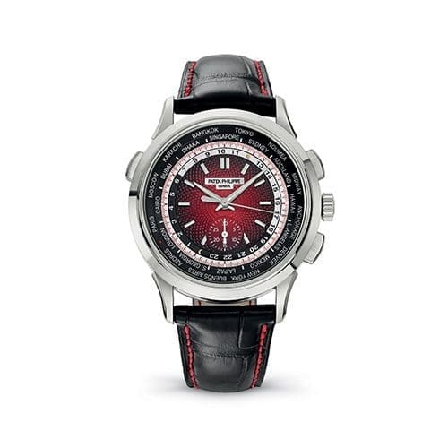 The rose-gold case of the special edition borrows the inimitable design of the Ref. 5304, showing a broad cambered and polished bezel as well as a case flank and strap lugs with white-gold intarsias in the form of arabesques and latticework. These decorative elements call for the ultimate in artisanship. The slide for actuating the minute repeater in the left-hand case flank is made of white gold as well. As a gesture of reverence to the global première of this grand complication in Singapore, the hour scale is a red-lacquered sapphire crystal ring decorated with white stars reminiscent of the flag of the Asian city-state. The view of the movement through the display back is framed by a pierced decor in 18K white gold to match the case intarsias. The shiny black alligator strap features red stitching color-coordinated with the hour scale.