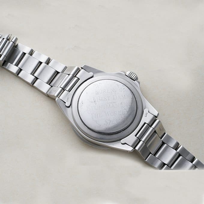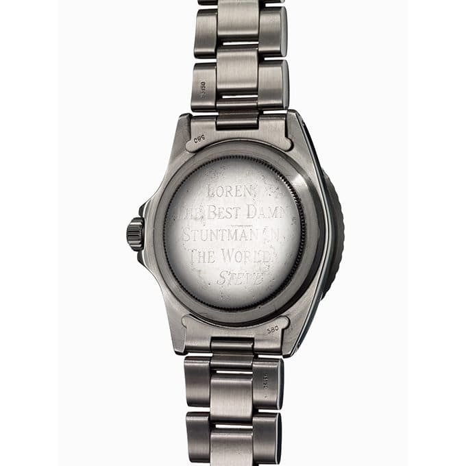 On the caseback of the submariner is inscribed “To Loren, the best damn stuntman in the world. Steve.”