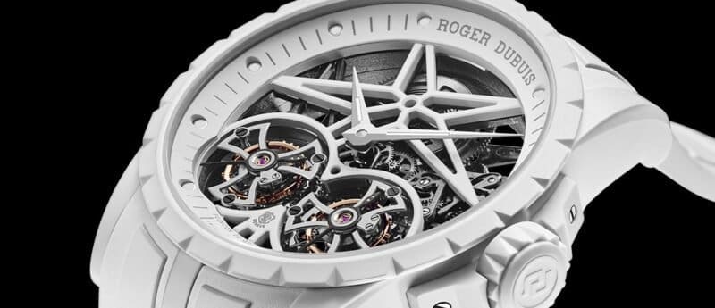 This model is a new interpretation of the brand’s signature movement, the double flying tourbillon. It possesses three world premieres. One, the bezel and the 45mm case are created in Mineral Composite Fiber (MCF), an ultra-white composite material made of 99.95% silica. Second, a patented luminescent material was developed that lasts 60% longer than anything comparable. Third, the Twofold strap is made from a luminescent FKM rubber, based on “LumiSuperBiwiNova” that makes part of the strap glow in the dark. Bearing the Poinçon de Genève, the watch is a limited edition of eight pieces.