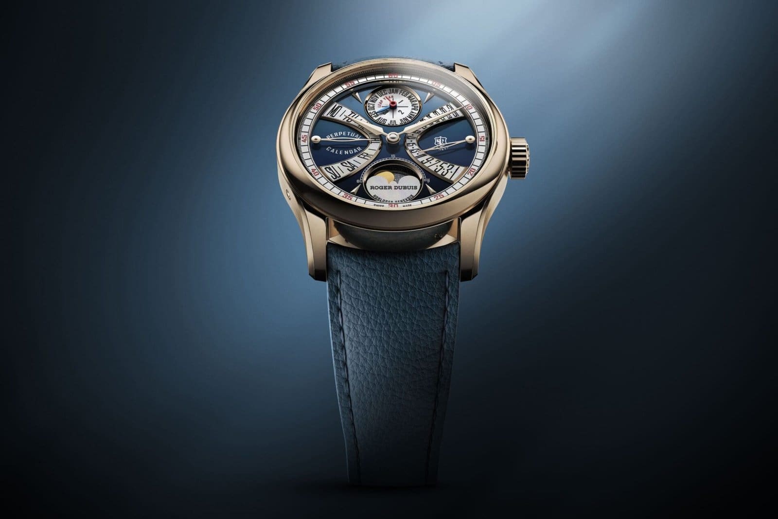 Roger Dubuis’ commitment to technical mastery shines through the Perpetual Calendar complication with its biretrograde display—a favourite of the founder and a hallmark of the Maison. The motion of the calendar hands along their curved tracks evokes the earliest Roger Dubuis designs from 1995, while a cleverly integrated system of co-axial toothed wheels enables the smooth display of both month and leap year indicators. The dial itself speaks to the brand’s signature layered architecture, with mother-of-pearl segments, a deep Leman Blue plate, and a poetic moonphase crafted in aventurine and 18K yellow gold.