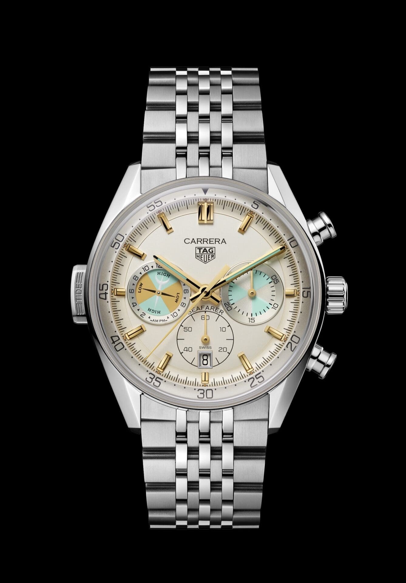 A different rhythm emerges with the TAG Heuer Carrera Seafarer, where the Maison’s maritime history resurfaces with clarity and intention. Inspired by the brand’s historic tide watches, the Seafarer translates nautical function into contemporary chronograph form. Maritime indications integrate seamlessly within the glassbox design language, preserving both tool-watch purpose and elegance. It is a reminder that precision has always extended beyond the racetrack.