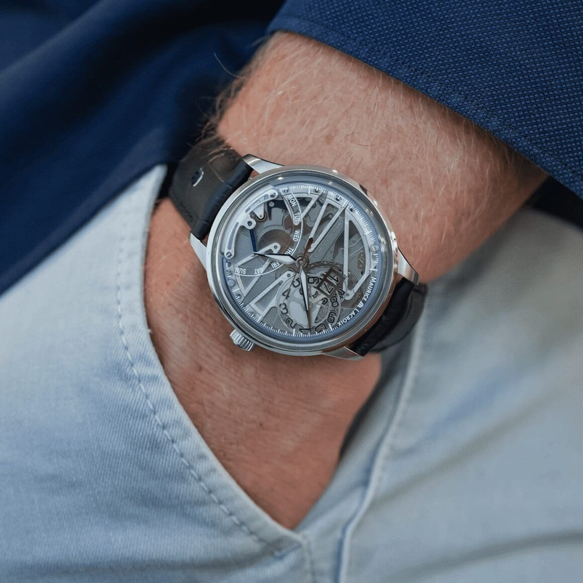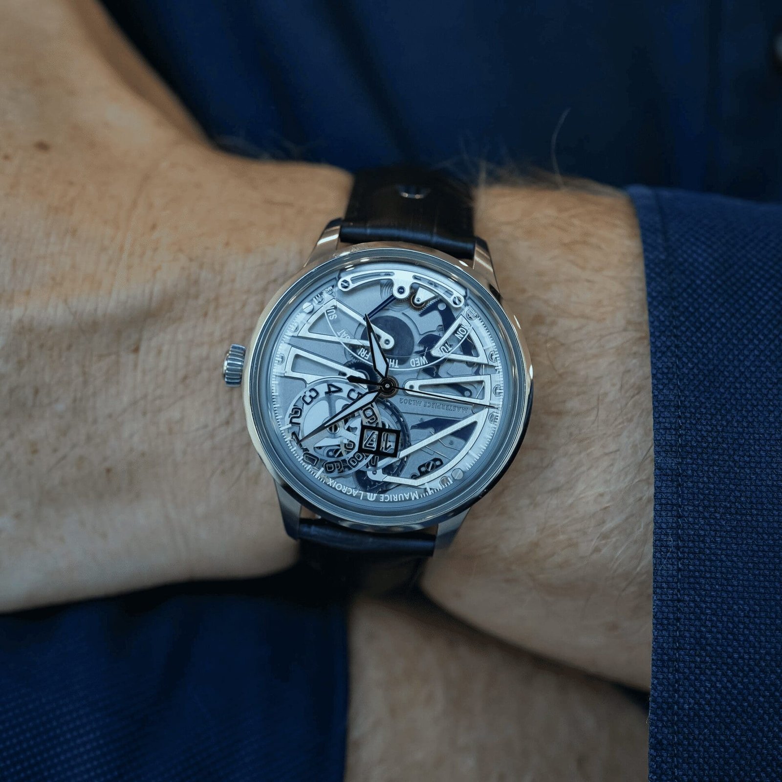 As Sunday night fades into Monday morning, the blue hand doesn’t just keep turning—it flicks back to the start in a microsecond of mechanical theater. It’s a small, private performance that happens once a week, a reminder that time doesn’t just flow; it has a pulse. Paired with the Grand Date—which uses two separate discs to make the date pop with sharp legibility—the watch prioritizes your ability to read the room (and the time) at a glance.