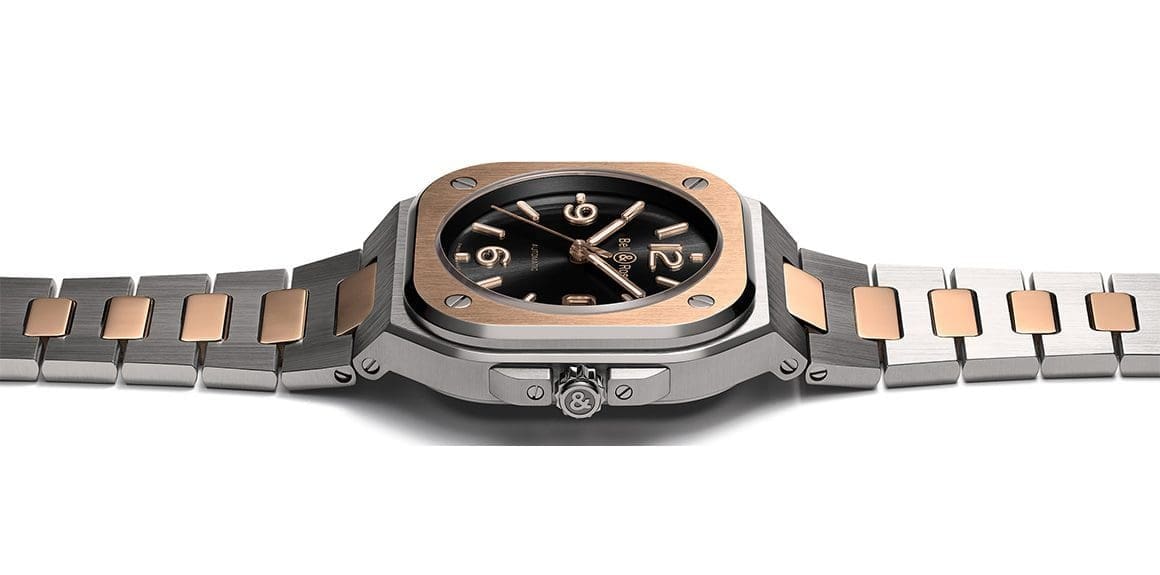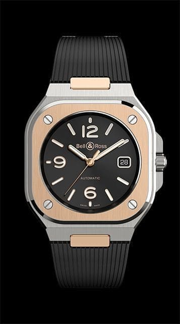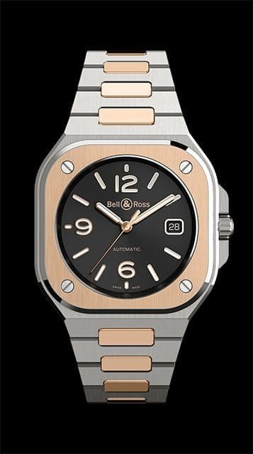 With its smart and classic look, this second addition to the BR05 urban collection takes you back into the 80’s spirit by mixing two?tones. It is a fusion of robustness and sophistication where a technical material meets a precious substance. Satin-finished and polished steel combines with 18 ct rose gold.