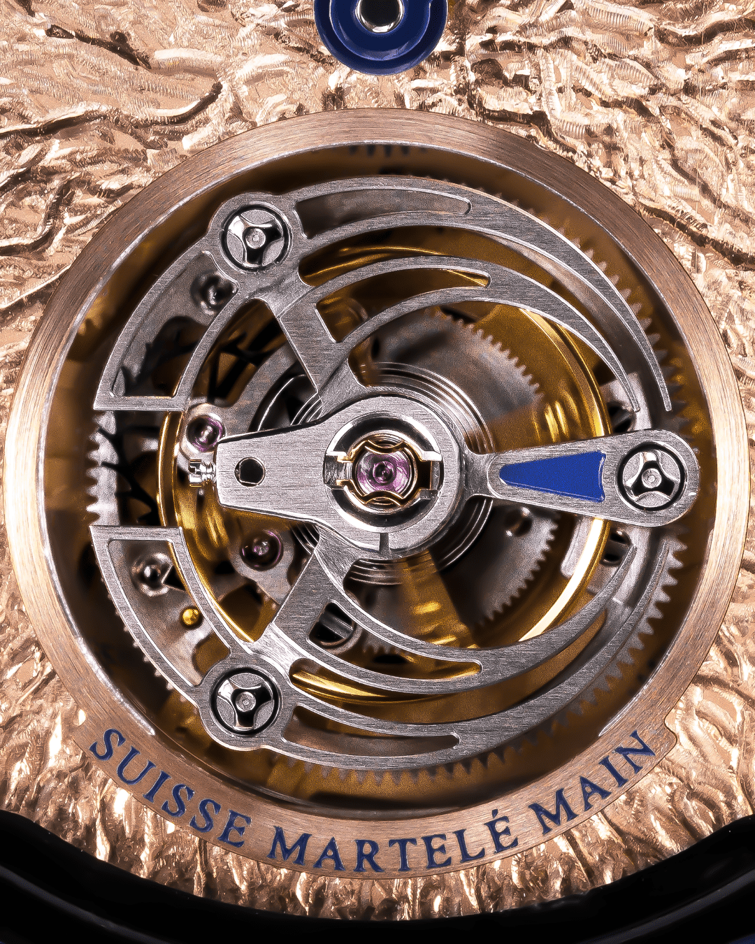 At the heart of the Roman Tourbillon lies a meticulously crafted 18K rose-gold dial, achieved through the art of hand-hammering. This labor-intensive process, requiring exceptional skill and precision, results in a unique texture that enhances readability while ensuring each watch is distinct. Given the complexity of the technique, only two pieces are produced per month, making each Roman Tourbillon a truly unique masterpiece.