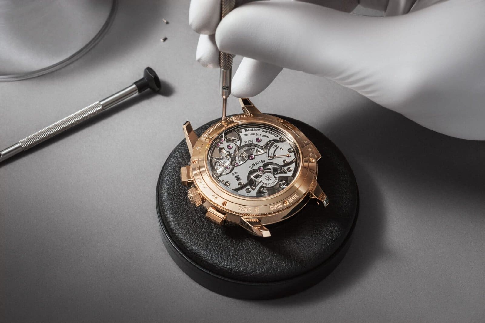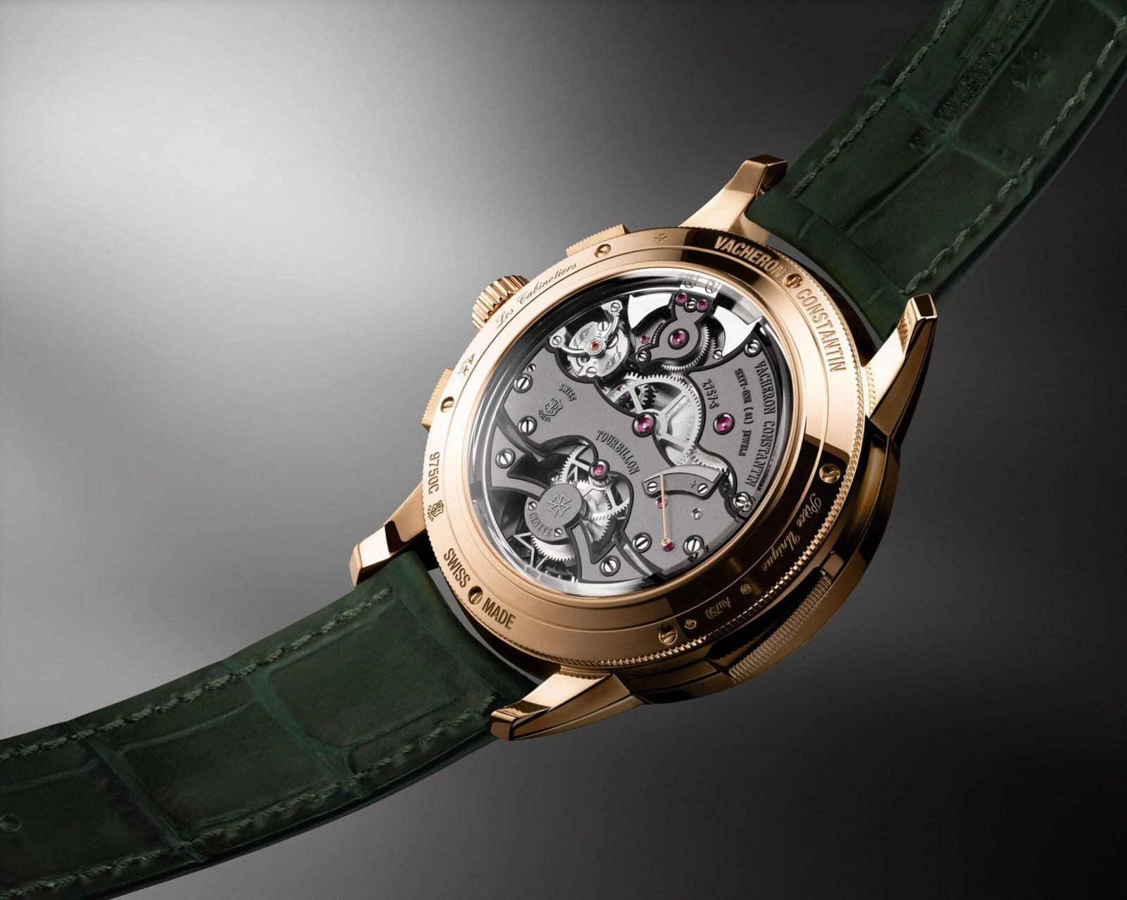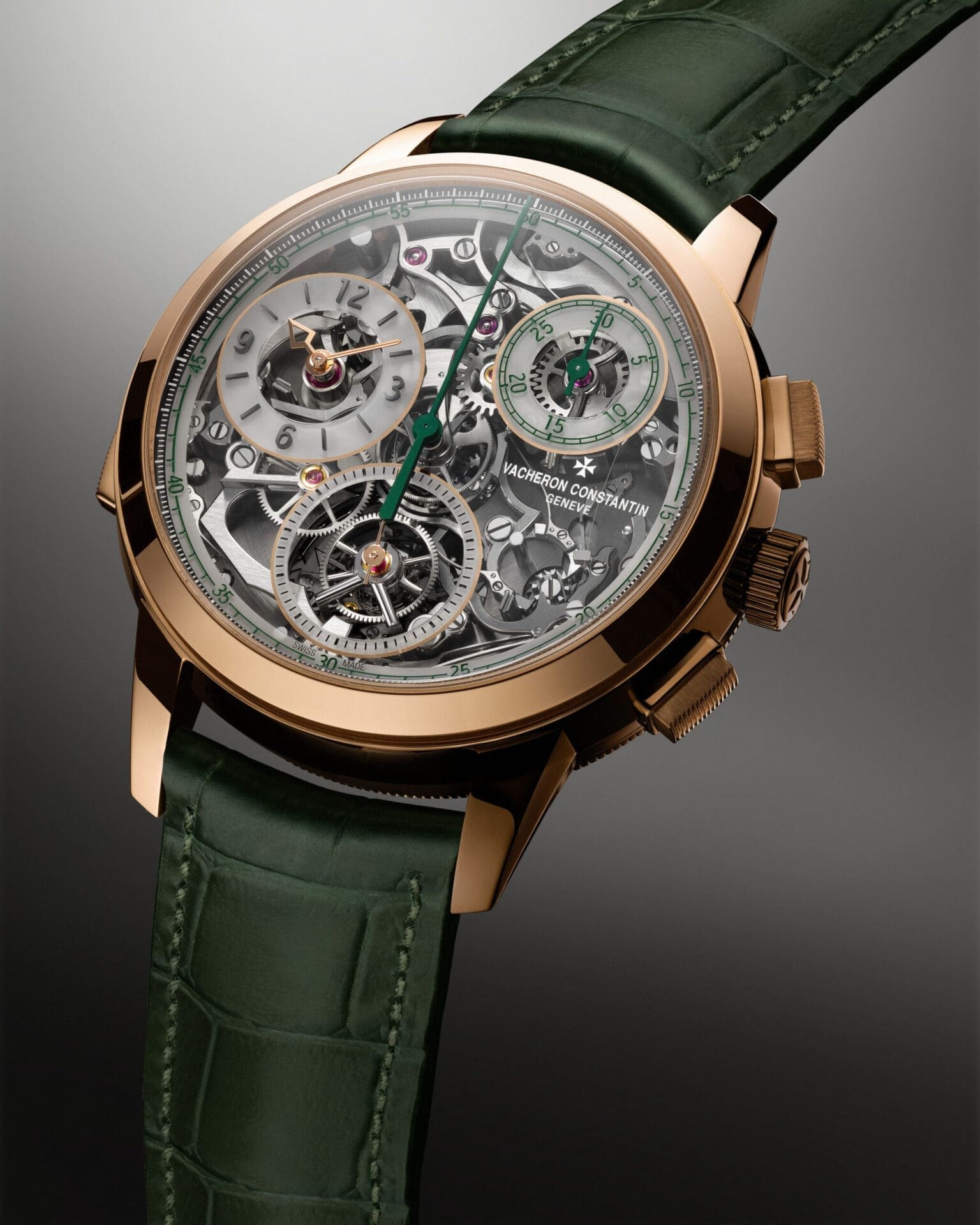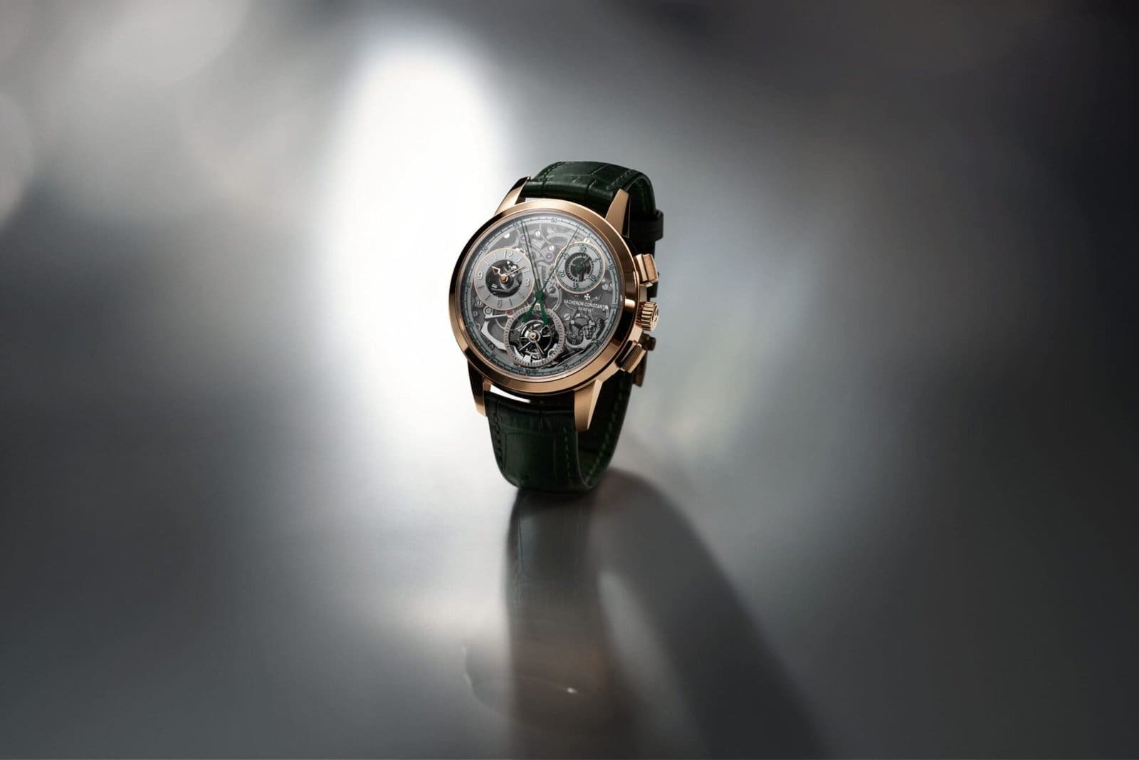 Aesthetically, the watch is a study in contrasts and finishes. The transparent sapphire dial, a mere 0.5mm thick, blends metallisation, NAC treatments, inked engravings, and PVD-coated olive green hands—matched seamlessly with a green alligator strap. Through the front and caseback, the eye is treated to a visual opera of hand-finished movement components: grained, satin-brushed, chamfered, bead-blasted, and polished to perfection. Even the flyweights of the striking mechanism are adorned with the engraved initials “JMV,” in homage to the Maison’s founder, Jean-Marc Vacheron.