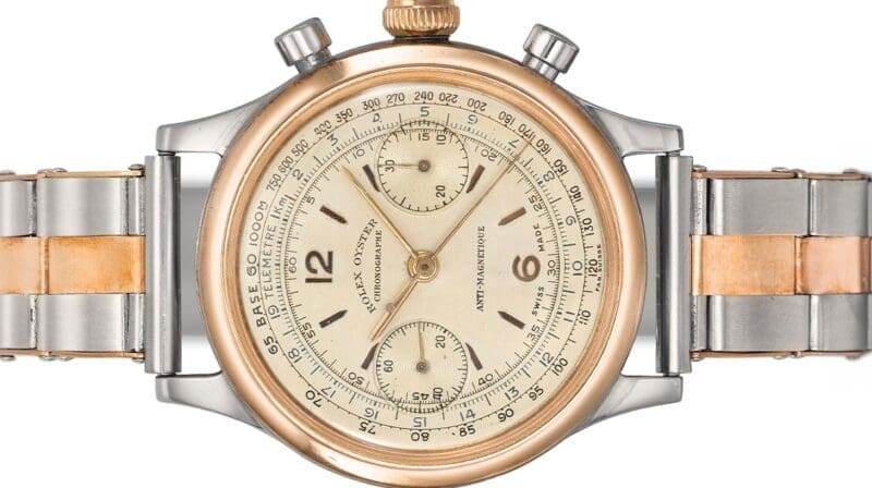 The Rolex ref. 3525 that once belonged to Andy Warhol is a very rare and highly desirable vintage wristwatch in its own right. With a timeless appeal, it was sold as lot 250 during the sale of his extensive jewellery and watch collections in New York on 4 December 1988, then fitted with a leather strap which was replaced to a later date by the present, perfectly matching stainless steel and pink gold version. This ref. 3525 is doubtlessly also one of the most appealing and attractive examples. It impresses with a superb multi-scale dial with both tachymeter and telemeter scales and raised gilt numerals and indexes, showing a gently aged, extremely beautiful and soft patina, free of any cosmetic enhancements.