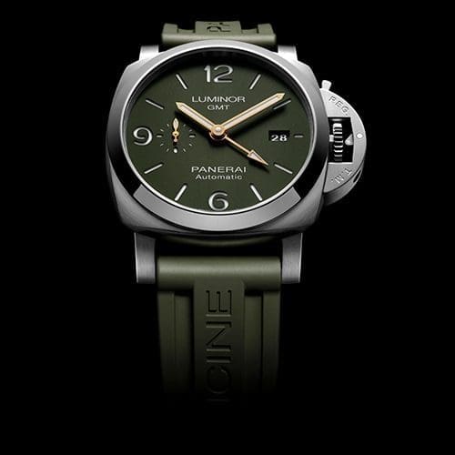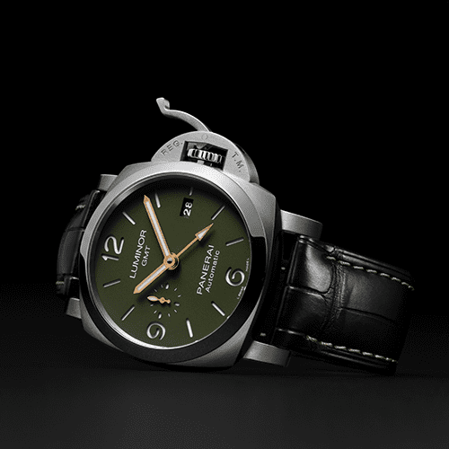 The case is matt military green, with a sandwich structure. Arabic numerals and markers, in recognisable Panerai style, are in white Super-LumiNova with green luminescence. It has centralised hour, minute and GMT hands. The small seconds sub-dial is at 9 o’clock, and the date at 3 o’clock. The primary strap is black semi-matt alligator leather with dark green stitching and brushed steel trapezoidal pin buckle. The watch comes with an additional military green rubber strap. It is water-resistant up to 30 bar or about 300 metres.