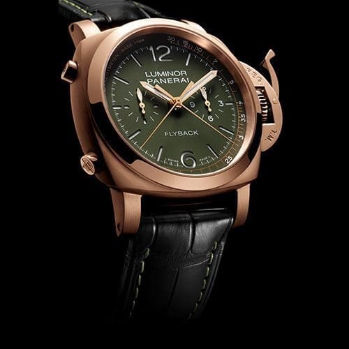 Panerai’s P.9100 calibre, an automatic mechanical movement, drives this watch. It also has twin spring barrels and a power reserve of three days, but its architecture is even more sophisticated than P.9010/GMT. This is because it has a chronograph movement with a vertical clutch and a column-wheel equipped with the flyback function. First appearing in 2013, it was the first automatic chronograph to be entirely developed and produced by Panerai, and it was created with the potential to be used in all kinds of sporting activities.
