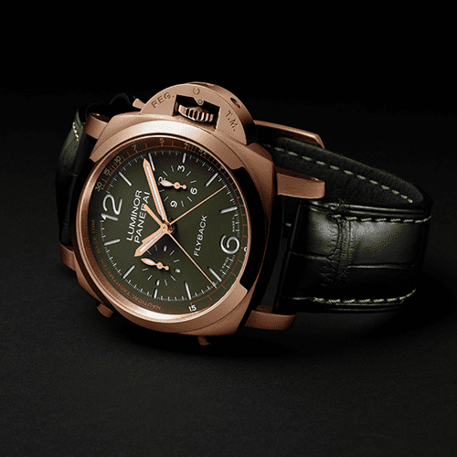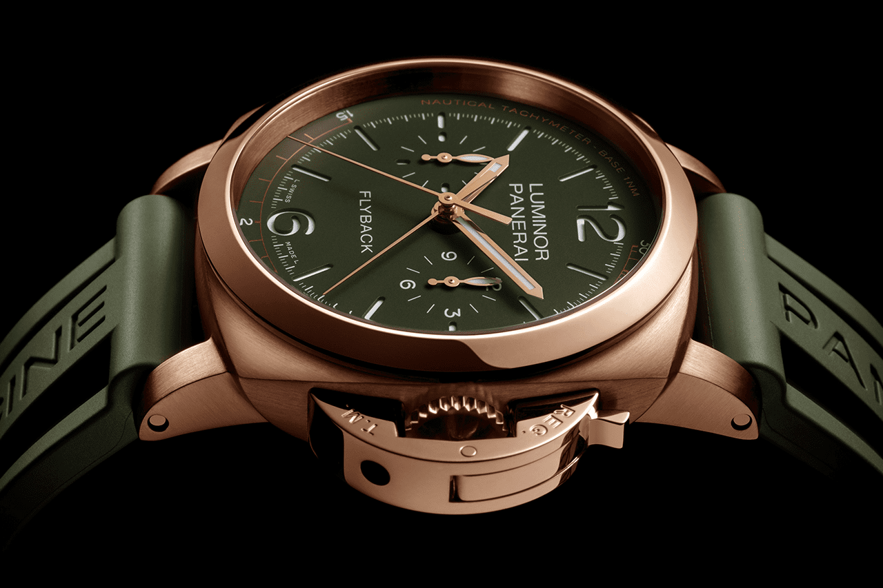 The Luminor Chrono Flyback 44 MM is naturally the more sophisticated variant of the two as it features Goldtech, a Panerai trademarked gold alloy developed at the brand’s Laboratorio di Idee. The case features the Goldtech with a brushed finish. It has the same 44 mm diameter as the GMT, but is slightly thicker at 16.87 mm. The bezel is in polished Goldtech, while the Safety Lock device has the same brushed Goldtech finish as the case. The cover is again a Sapphire dial made from carborundum. The case-back is also a 12-sided screw-back, but here, it is in polished Goldtech with a sapphire crystal porthole. It has the same engraving but is done using the metallisation method.