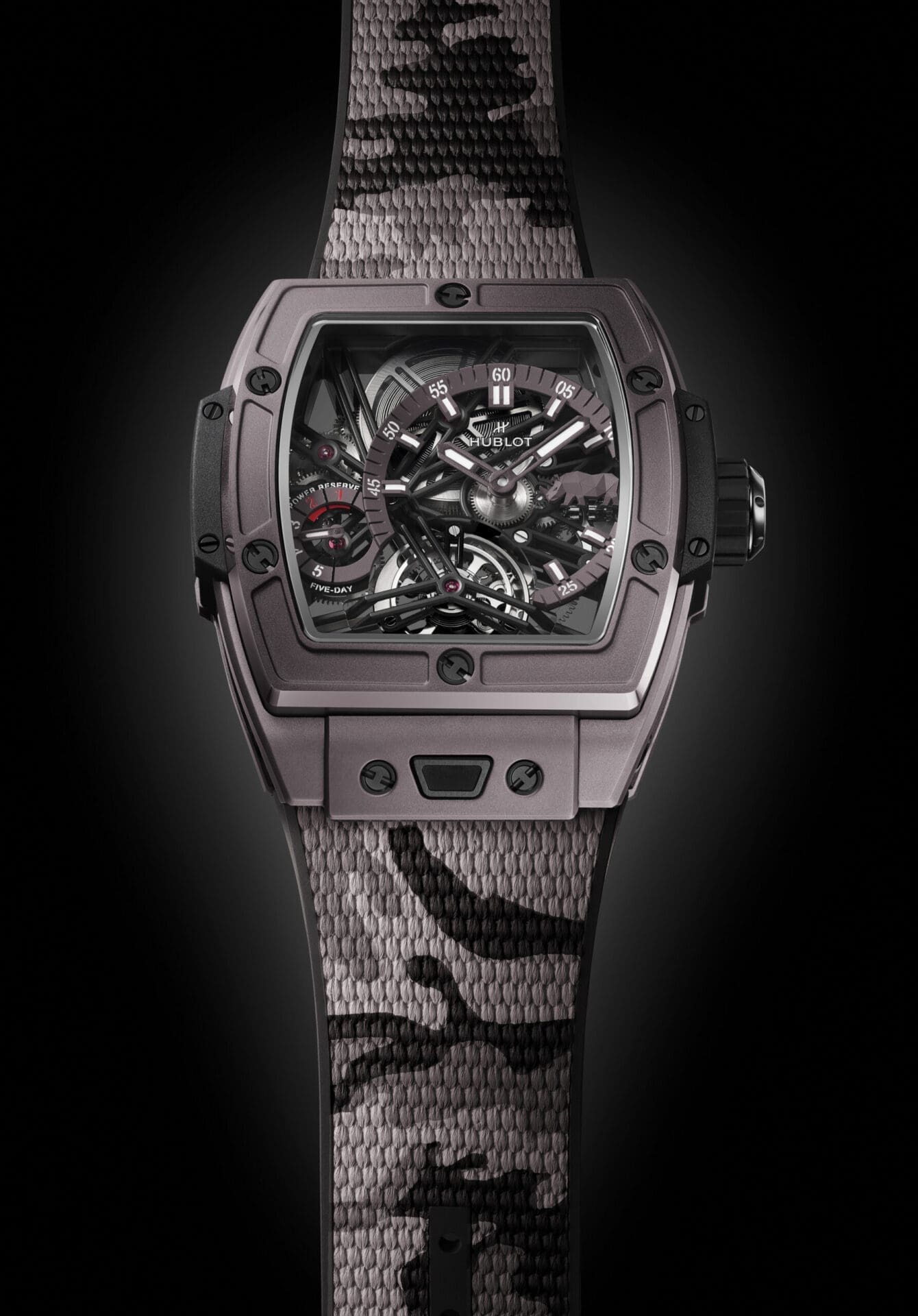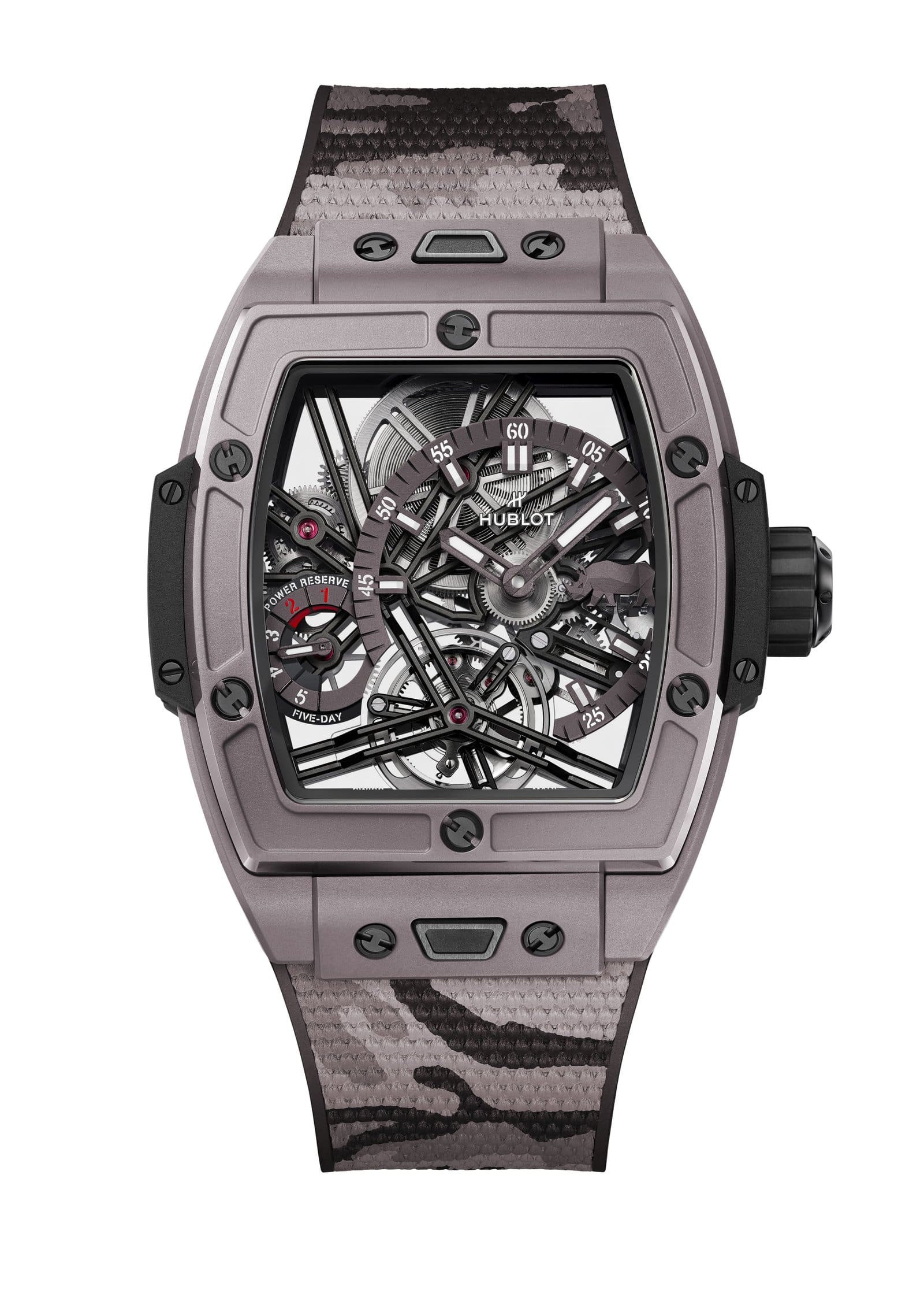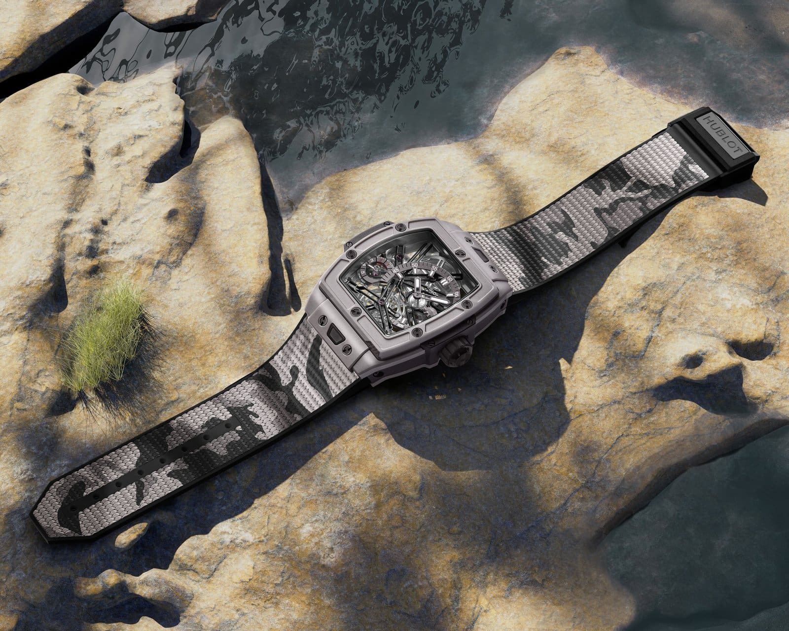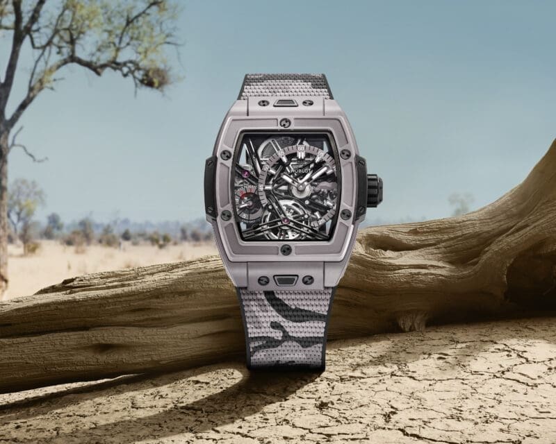 Designed with meticulous detail, the Spirit of Big Bang Tourbillon’s 42mm case is sculpted from micro-blasted and polished “warm grey” ceramic, capturing the rhino’s distinctive hue. The watch also offers a bold aesthetic statement, featuring a skeletonized dial, a five-day power reserve, and Hublot’s HUB6020 Manufacture calibre—a hand-wound tourbillon movement that balances time display with innovative design. Two interchangeable straps—a sleek grey fabric and a camouflage-patterned rubber—complete this exclusive timepiece.