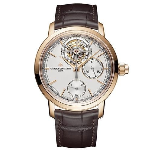 Vacheron Constantin unites two horological complications within the Traditionnelle collection. Considered an emblem of Haute Horlogerie, the tourbillon is combined with a monopusher chronograph function. The tourbillon – featuring the Maltese cross – takes pride of place on the silvered opaline at 12 o’clock. The hour-markers, as well as the 42.5 mm case, are in 18K pink gold. The strap is dark brown Mississippiensis alligator leather with large square scales and saddle-finish.