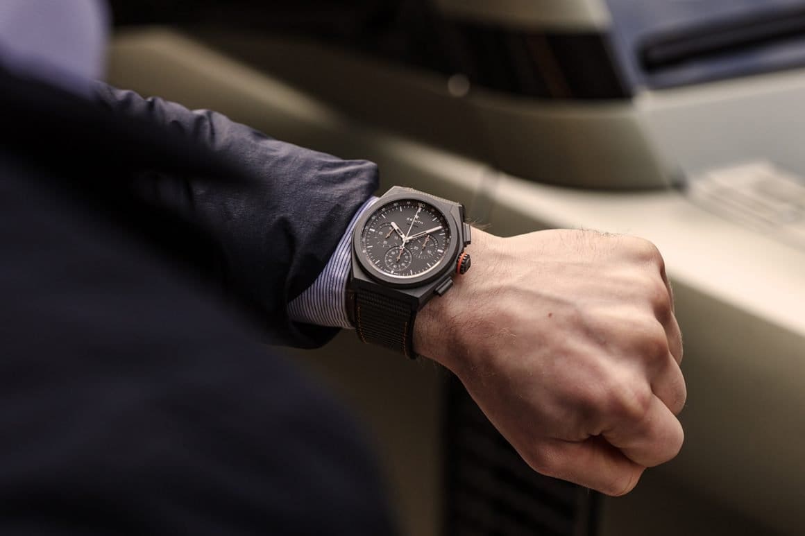 Crafted in microblasted titanium, the case absorbs light from all angles to better accentuate its faceted surfaces. Paired with a matching closed grey dial, the redesigned display features for the first time in a DEFY 21 a linear power reserve window, with the slightest touches of color for legibility. The Chronograph power-reserve indication is at 12 o’clock, hours and minutes in the centre, small seconds at 9 o’clock, central chronograph hand, 30-minute counter at 3 o’clock and a 60-second counter at 6 o’clock.